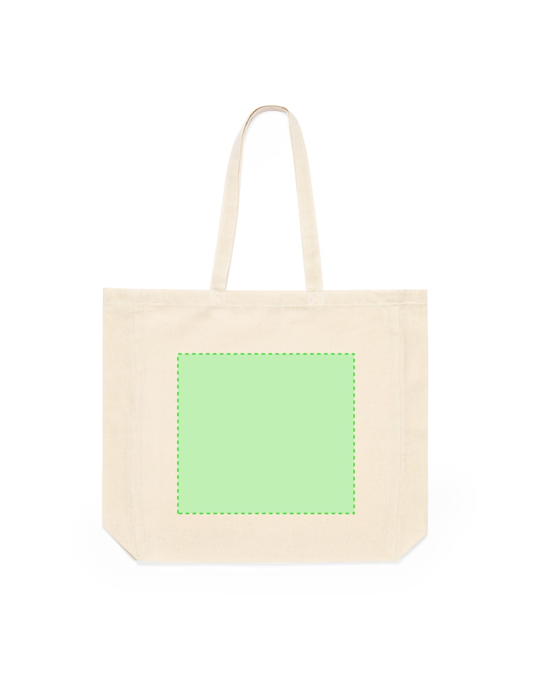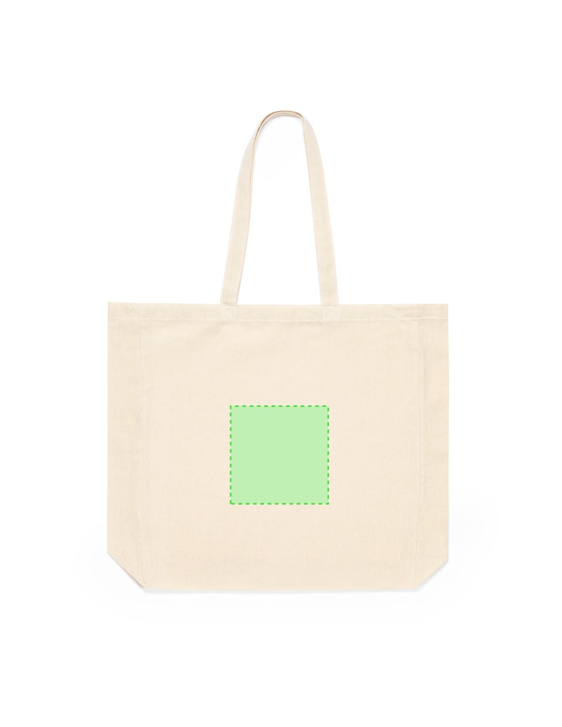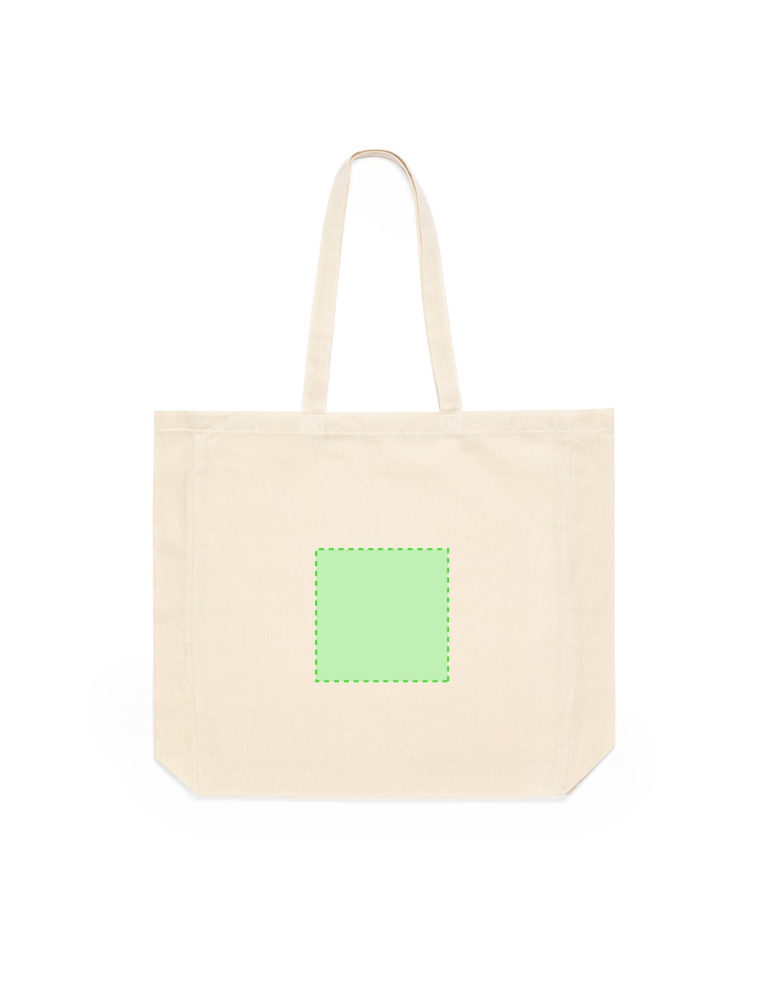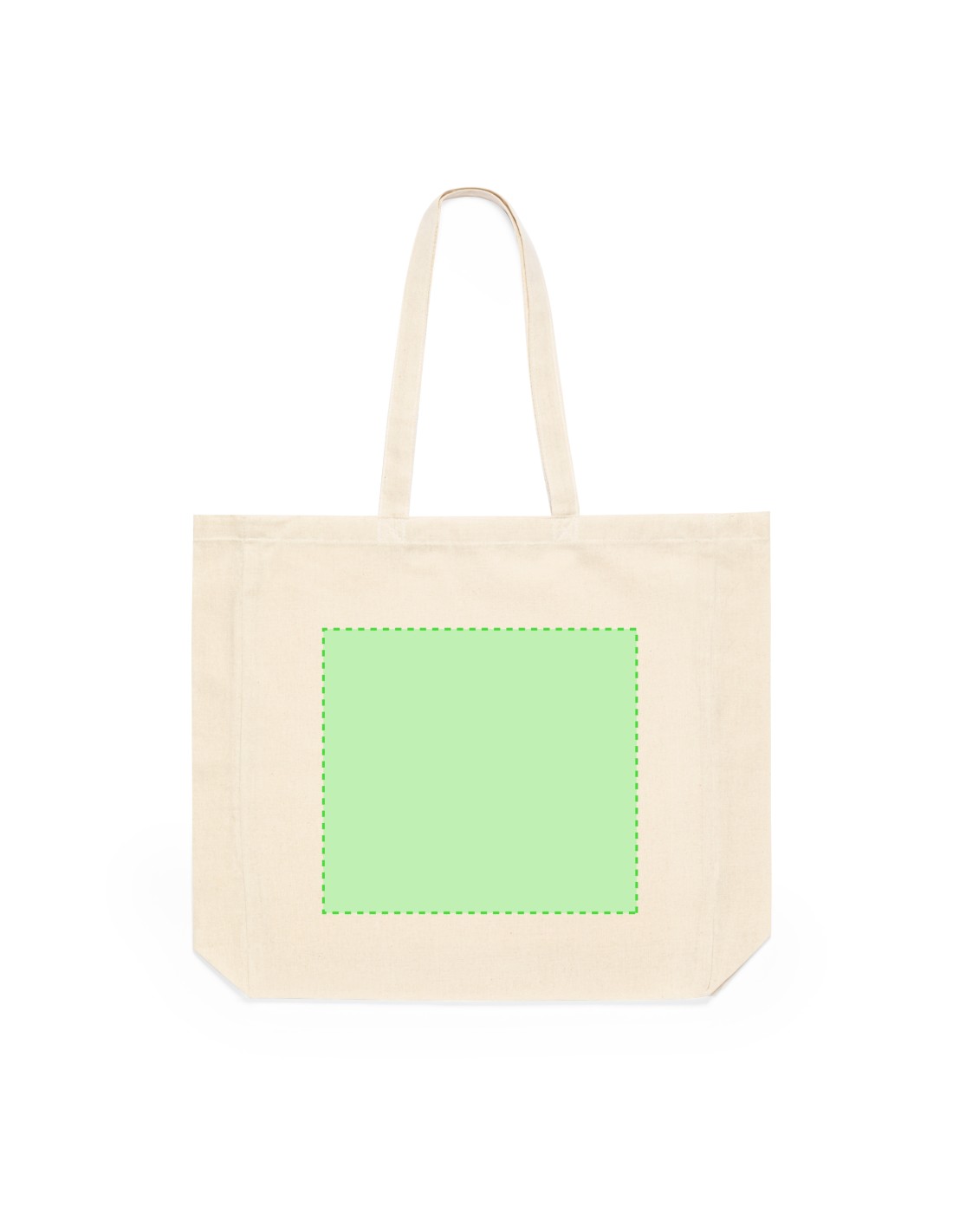 Bolsa fabricada en algodón 100%, de acabado natural y en 220g/m2. De acabado cosido, con fuelle en base y asas medianas reforzadas (60 x 2,5 cm). Resistencia hasta 10 kg de peso.