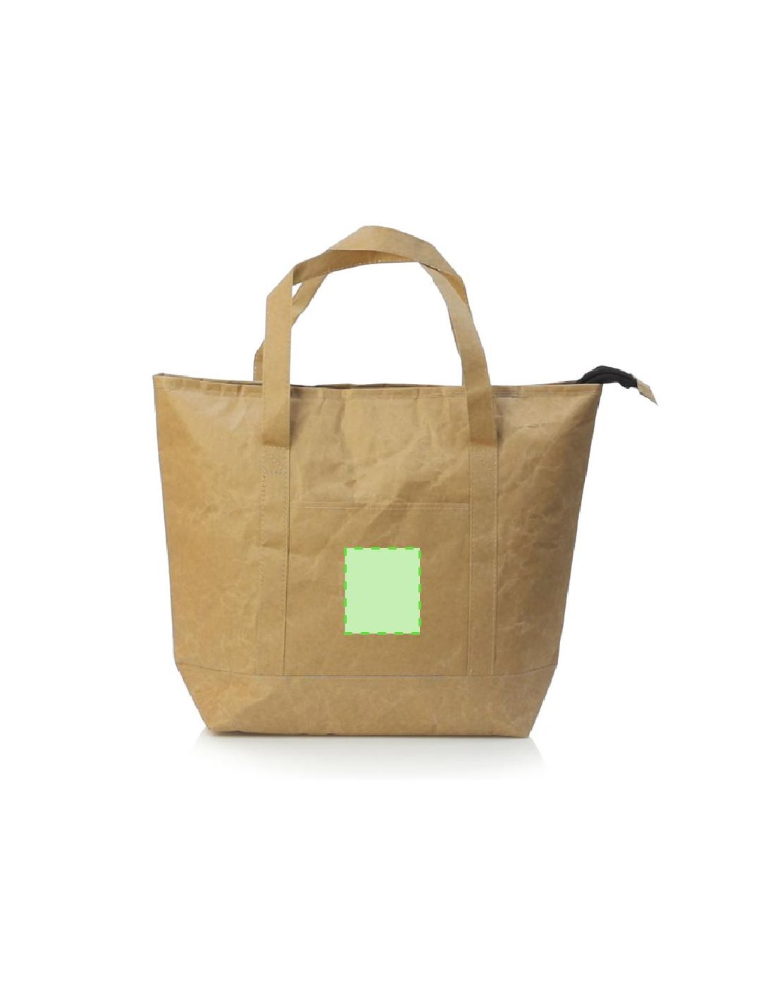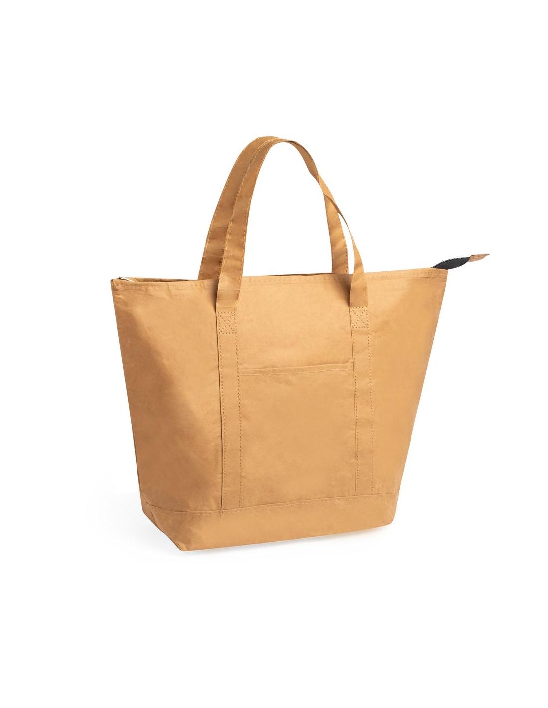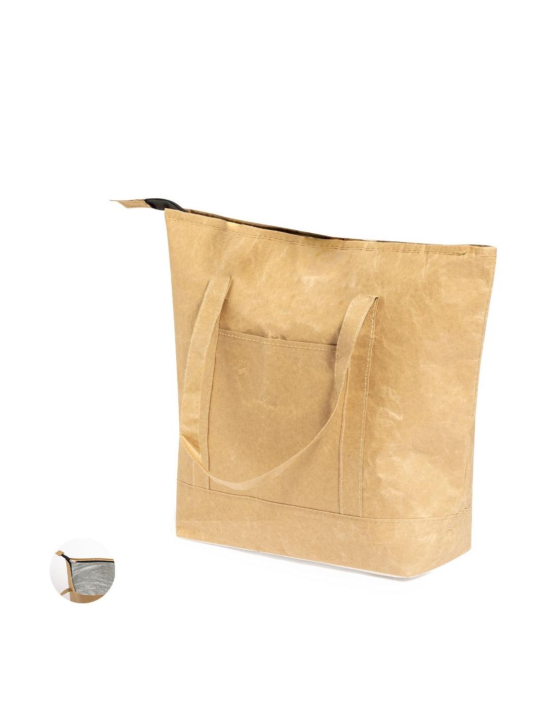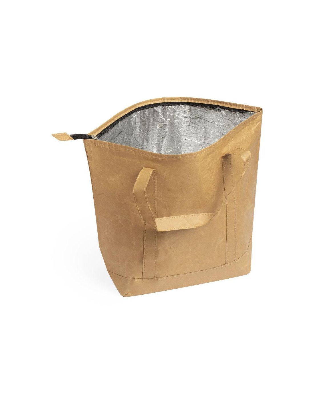 Innovadora bolsa térmica en papel laminado, resistente a las salpicaduras de agua y con interior en aluminio. Tamaño 43x33+14 cm, con cierre de cremallera y amplio bolsillo en frontal. Asas medianas reforzadas de 45 cm, libre de BPA.