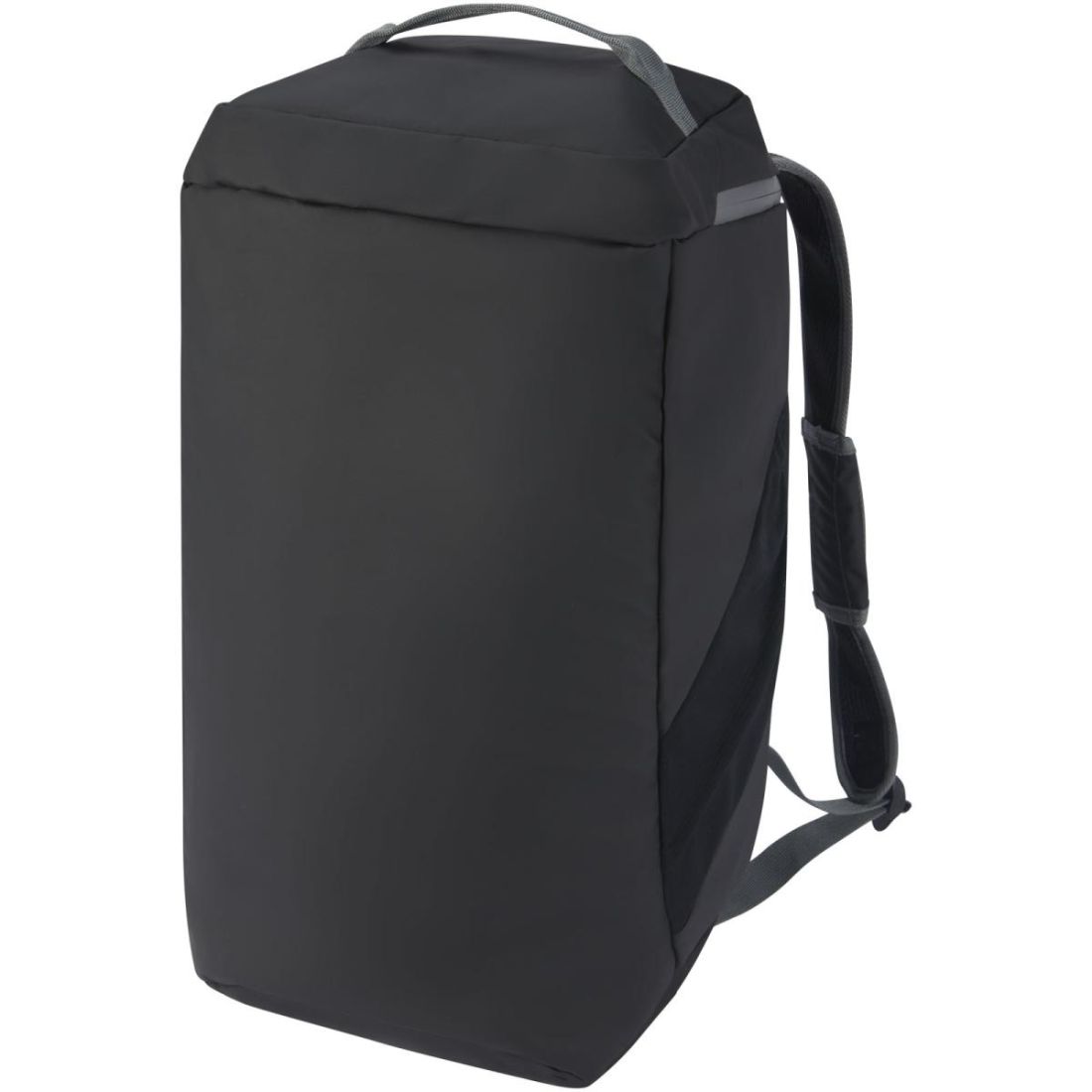 Mochila de lona 2 en 1 resistente al agua fabricada con materiales reciclados con certificado GRS, incluidas las cremalleras. Cuenta con un espacioso compartimento principal con abertura en forma de U para un fácil almacenamiento y acceso, dos bolsillos laterales con cremallera (incluido un compartimento para zapatos), un bolsillo delantero con cremallera, un bolsillo para la botella de agua de malla en la parte trasera y ribetes reflectantes para mayor visibilidad. Esta bolsa se puede llevar de 3 maneras diferentes: en mano, en el hombro o como mochila con sus correas acolchadas y ajustables. Los materiales reciclados GRS están presentes en el tejido principal, el forro, las correas y las cremalleras. Capacidad: 35 litros. Sin PVC.