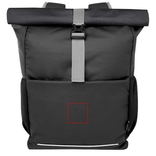 Bolsa para bicicleta enrollable e impermeable fabricada con material reciclado con certificación GRS. Cuenta con un compartimento acolchado para portátil de 15", múltiples bolsillos organizadores, cierre ajustable de gancho y bucle para facilitar su colocación en diversas bicicletas y ribetes reflectantes para mayor visibilidad. Los materiales reciclados GRS están presentes en el tejido principal, el forro, las correas y las cremalleras. Capacidad: 20 litros. Sin PVC.
