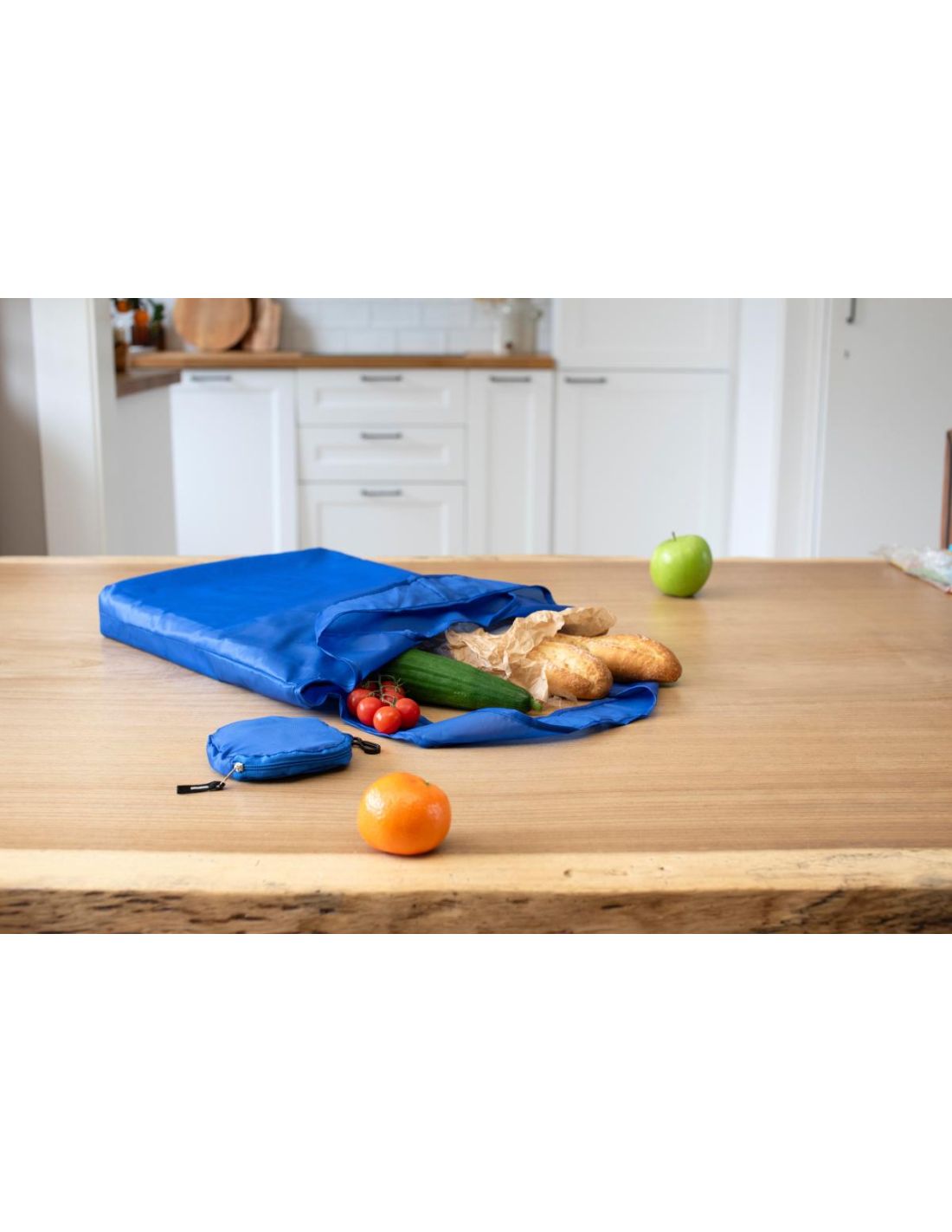 Bolsa plegable de poliéster (190 T) en una funda con cierre cremallera y gancho de plástico.