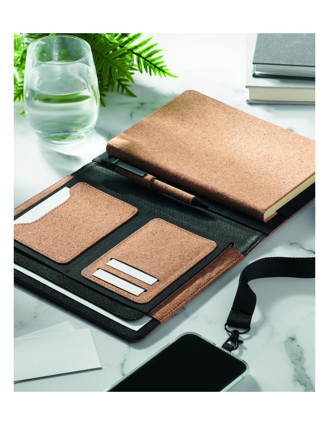 Porta documentos de corcho A5. Incluye libreta A5 con tapa dura de corcho. 192 páginas rayadas de papel reciclado (96 hojas). Bolígrafo y portabolígrafos a juego. 2 tarjeteros y un compartimento grande. Banda elástica de cierre.