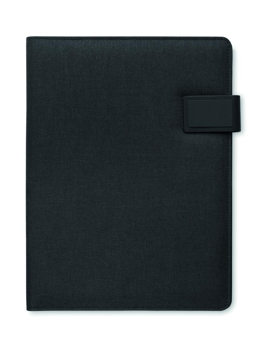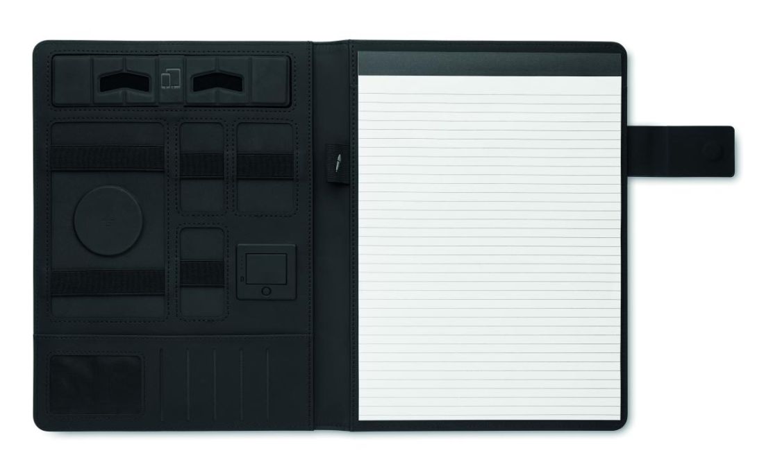 Portadocumentos A4 con funda de lino-PU. Power bank de 5000 mAh y cargador inalámbrico magnético de 15W. Bloc de notas de 20 hojas rayadas. Múltiples compartimentos internos. Cierre magnético. Portabolígrafos elástico.