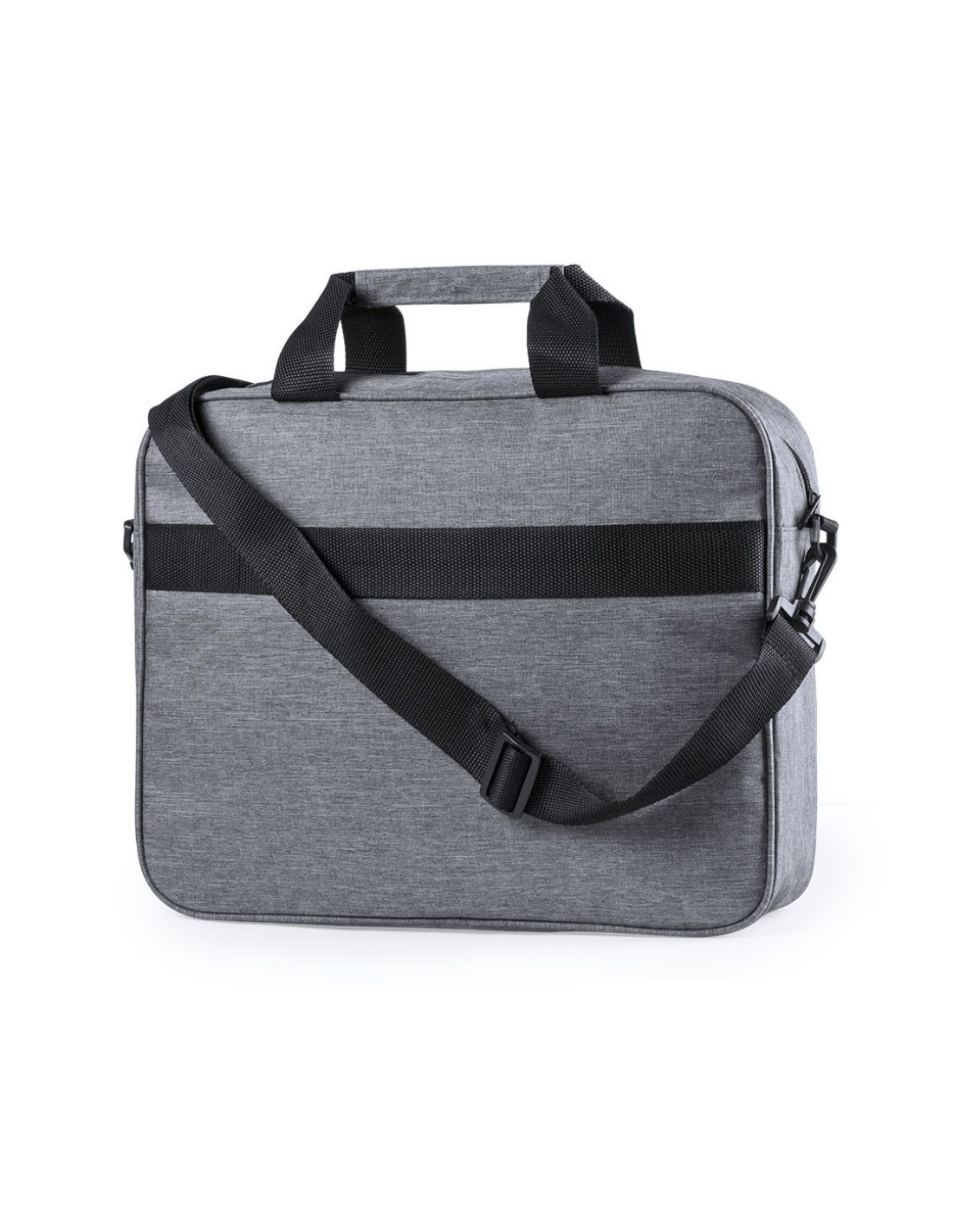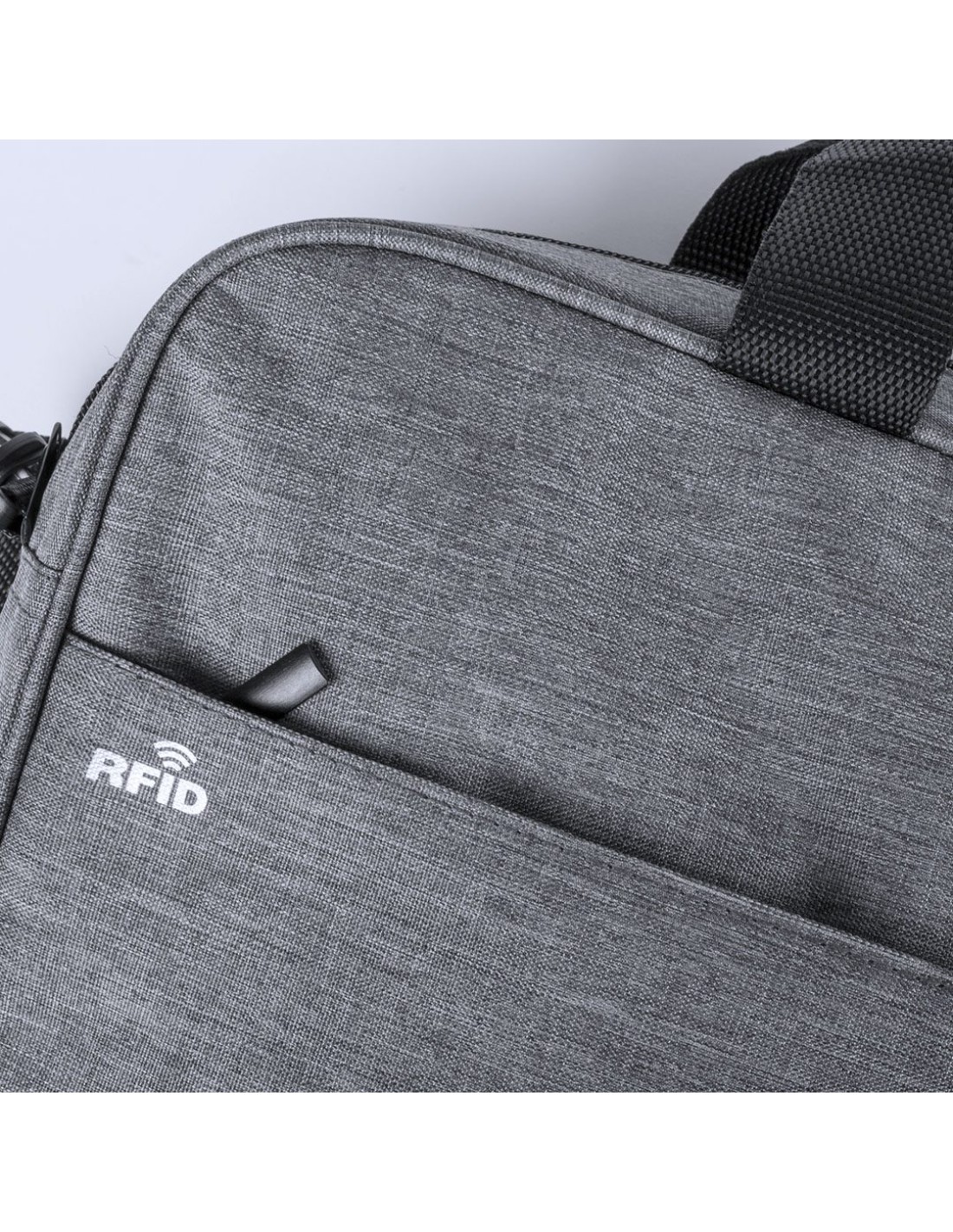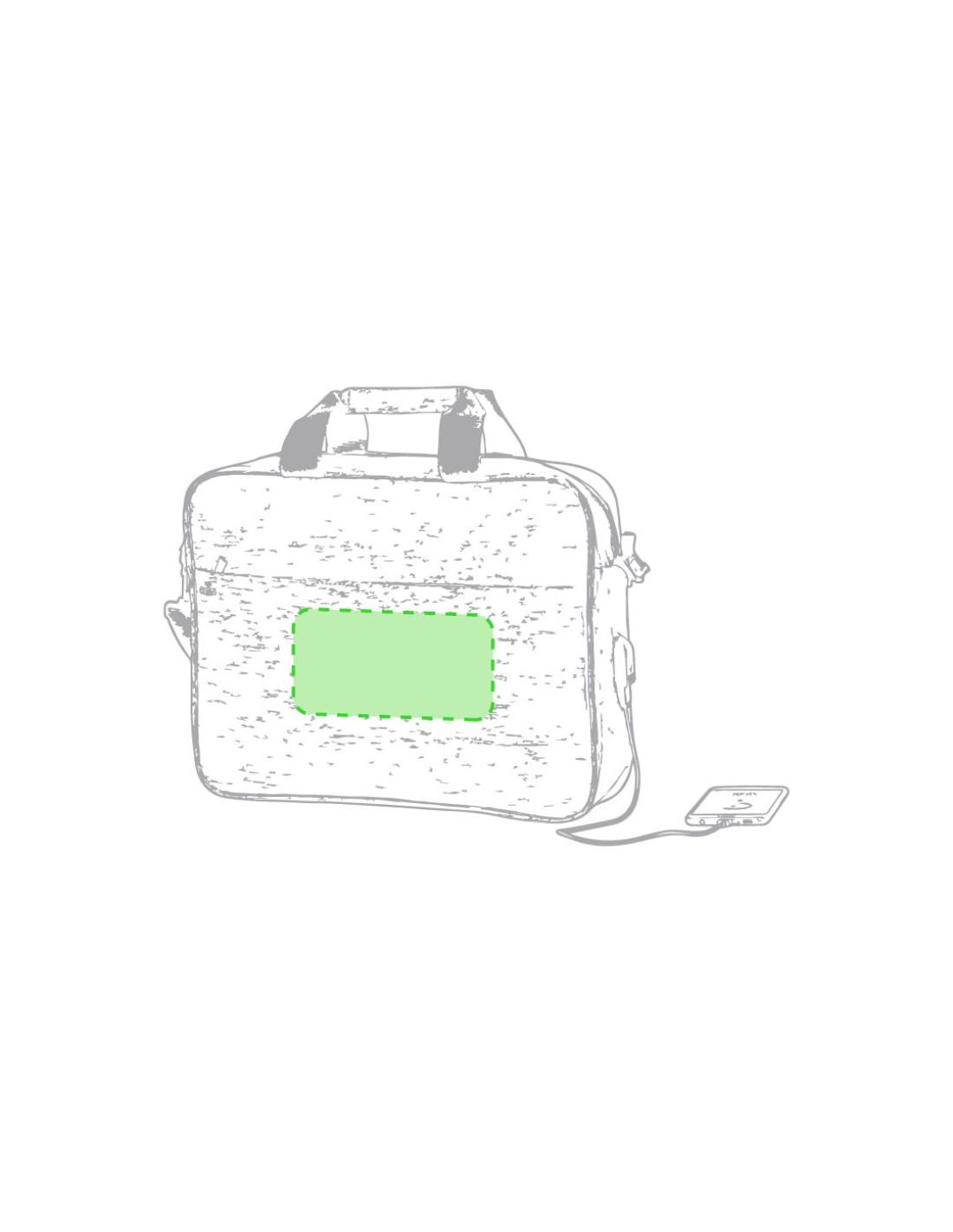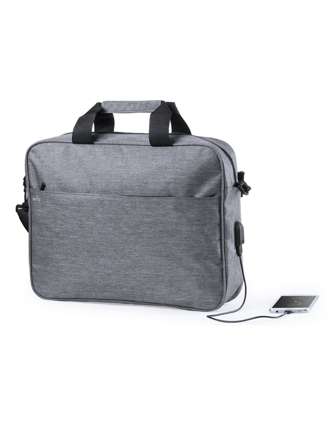 Portadocumentos de seguridad, con diseño urbano en resistente poliéster 300D. Bolsillo interior con protección de seguridad RFID (Identificación por Radio Frecuencia) que mantiene seguros los datos de la tarjeta y demás dispositivos. Asas con protección y compartimento principal con cierre de cremallera. Conexión USB -powerbank no incluido-, con bolsillos interiores acolchados para ordenador portátil de hasta 15 pulgadas y tablets de hasta 10 pulgadas. Cinta para hombro ajustable con protector acolchado.
