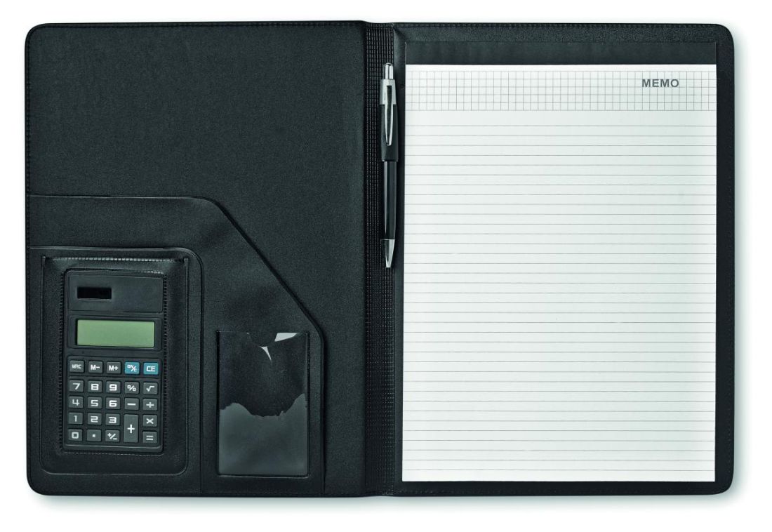 Portafolios A4 con calculadora solar, bolígrafo con tinta azul y bloc de 20 hojas con rayas. Fabricado en poli piel.