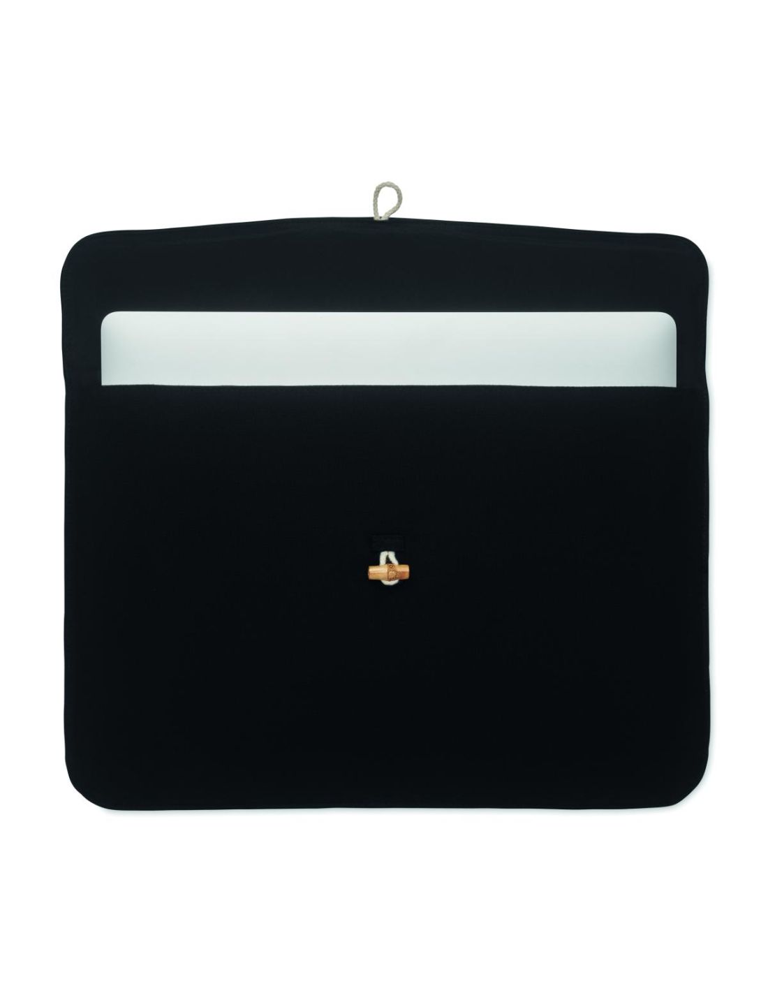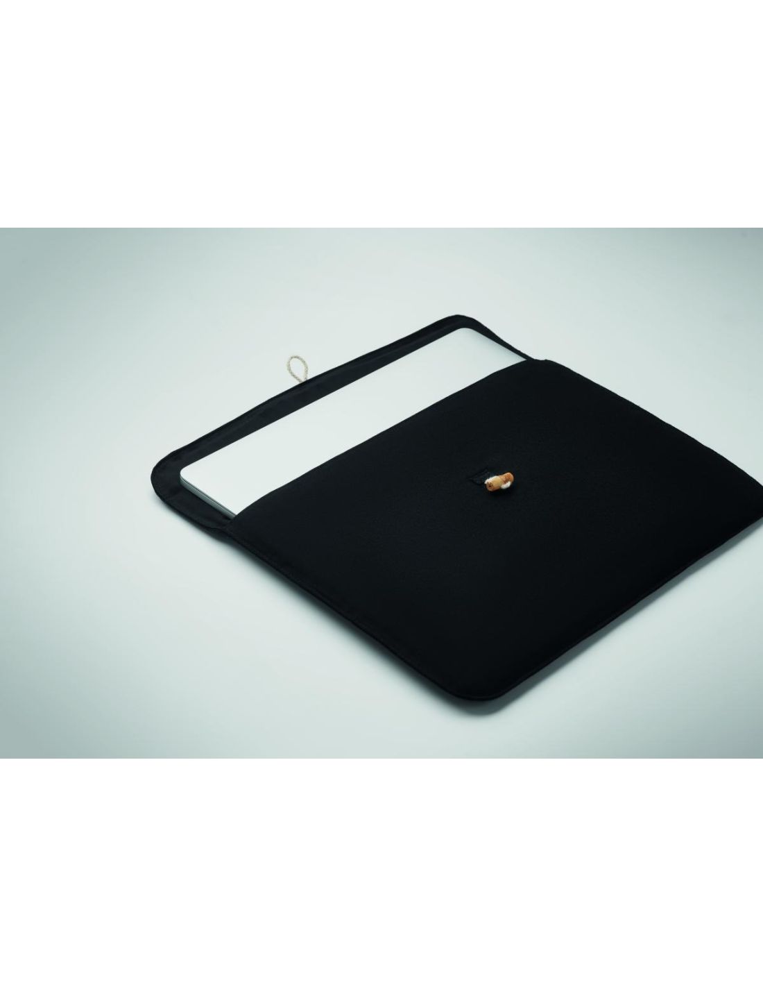 ''Bolsa acolchada para portátil de 15'''' en algodón de 220 gr/m². Forro interior de 120 gr/m². Cierre de botón de bambú.''