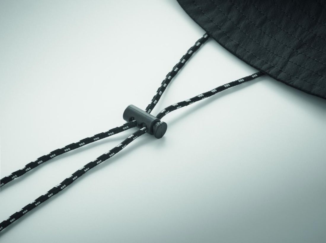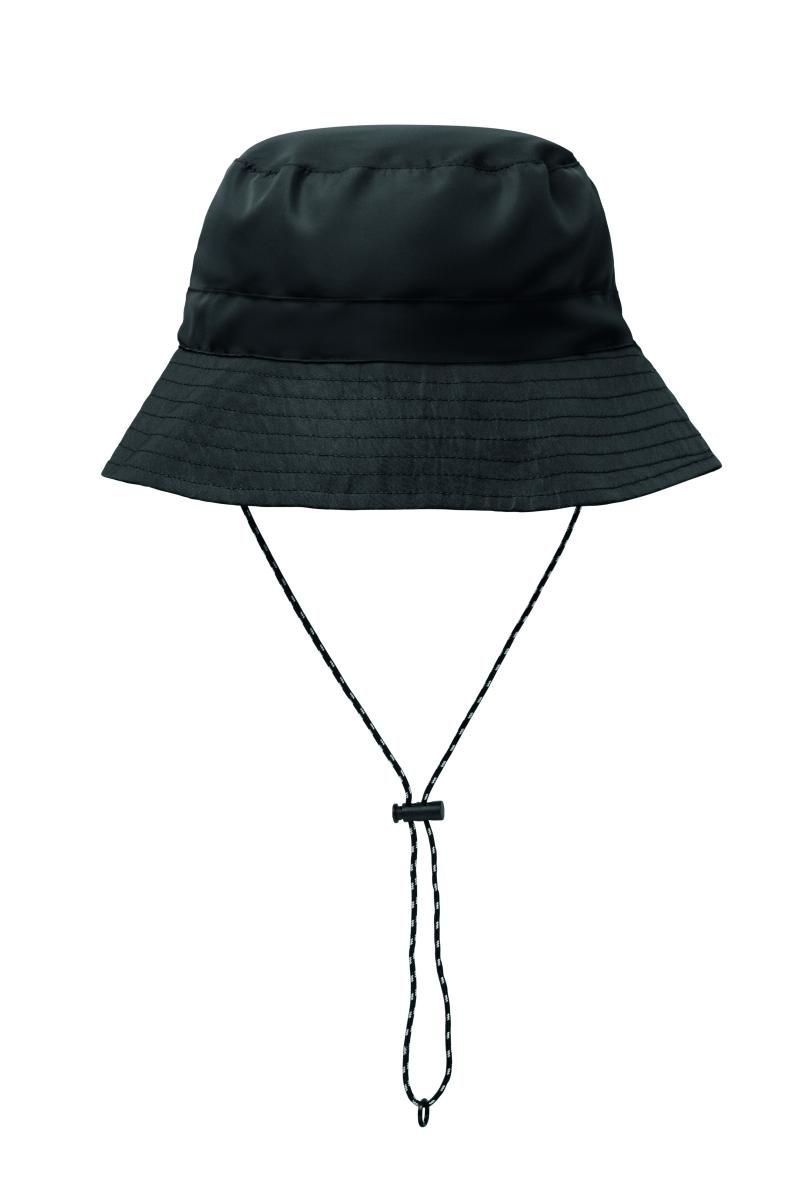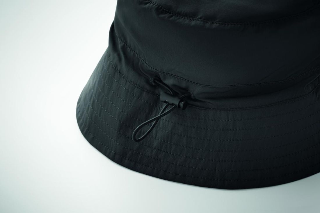Gorro de pescador de poliéster repelente al agua, incluye bolsa de material propio con mosquetón de ABS. 64 gr/m².