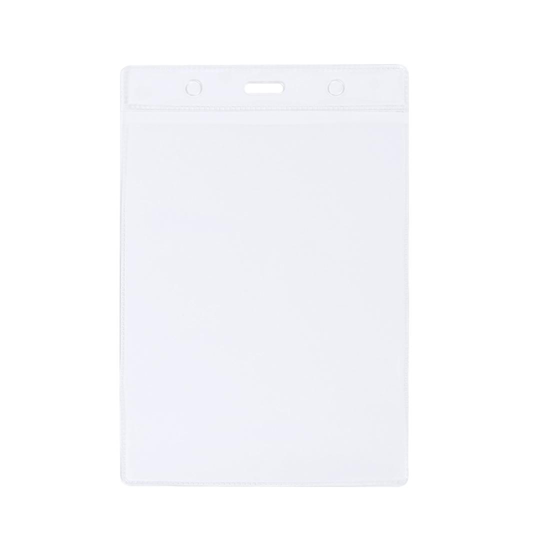 Identificador vertical de PVC. Práctico porta acreditaciones con parte superior reforzada y perforaciones tanto para la sujeción central como en los laterales.