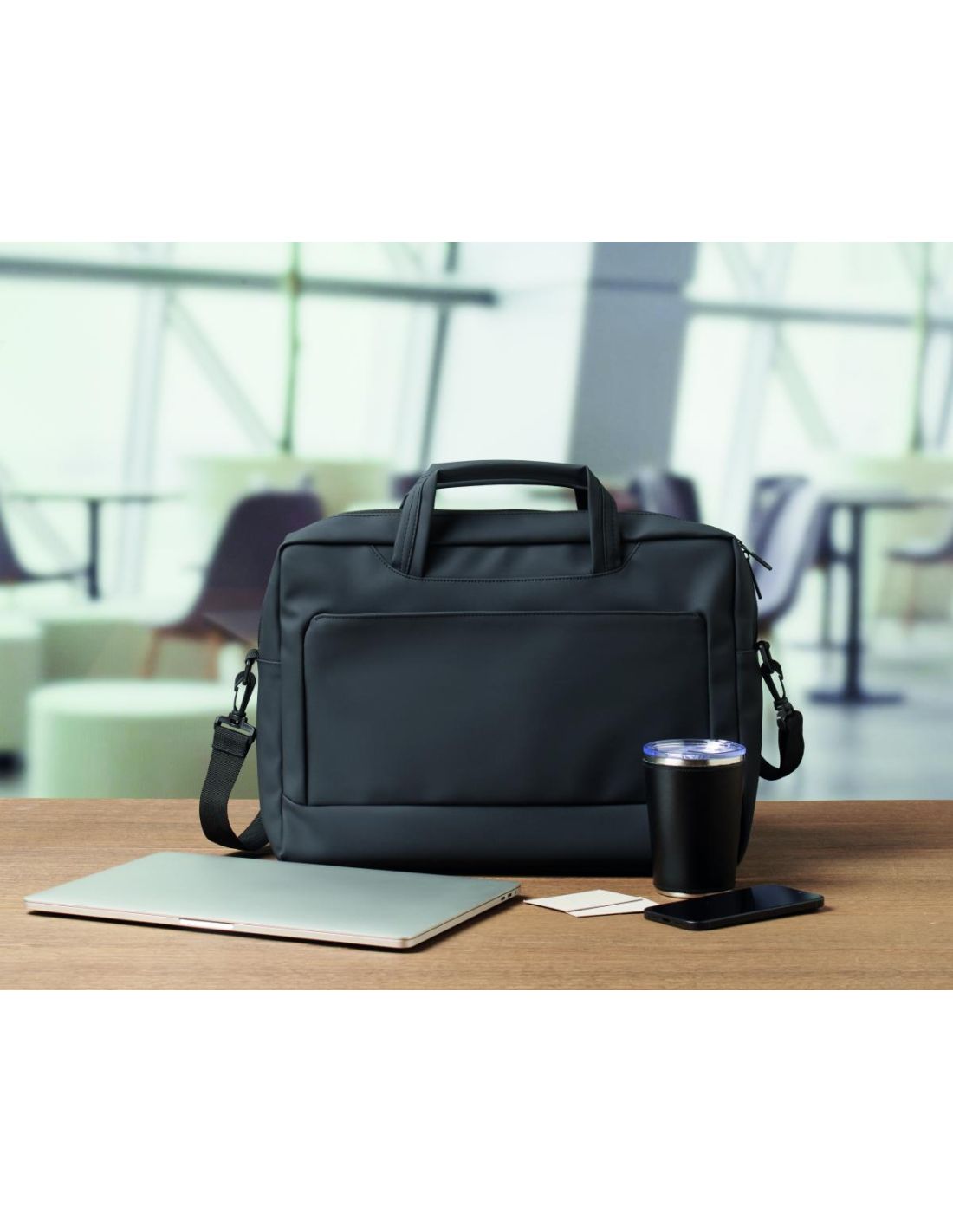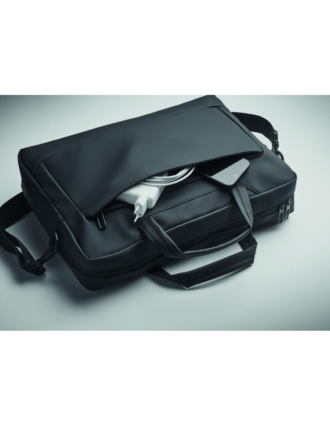 Maletín portadocumentos para portátil de 15 pulgadas en suave PU con parte trasera acolchada. Un compartimento acolchado para el portátil y bolsillo frontal con cremallera con varios compartimentos. Forro de poliéster RPET 210D. 2 asas y una correa de hombro ajustable. Correa para el trolley.