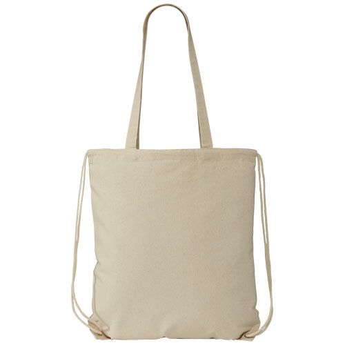 Bolsa de algodón multifuncional con asas largas y cuerda que se puede llevar como bolso o mochila. Gran compartimento principal con cierre de cuerda. Cuenta con dos asas extensibles de 31 cm de longitud. Capacidad: 6 l, resistencia para hasta 5 kg.