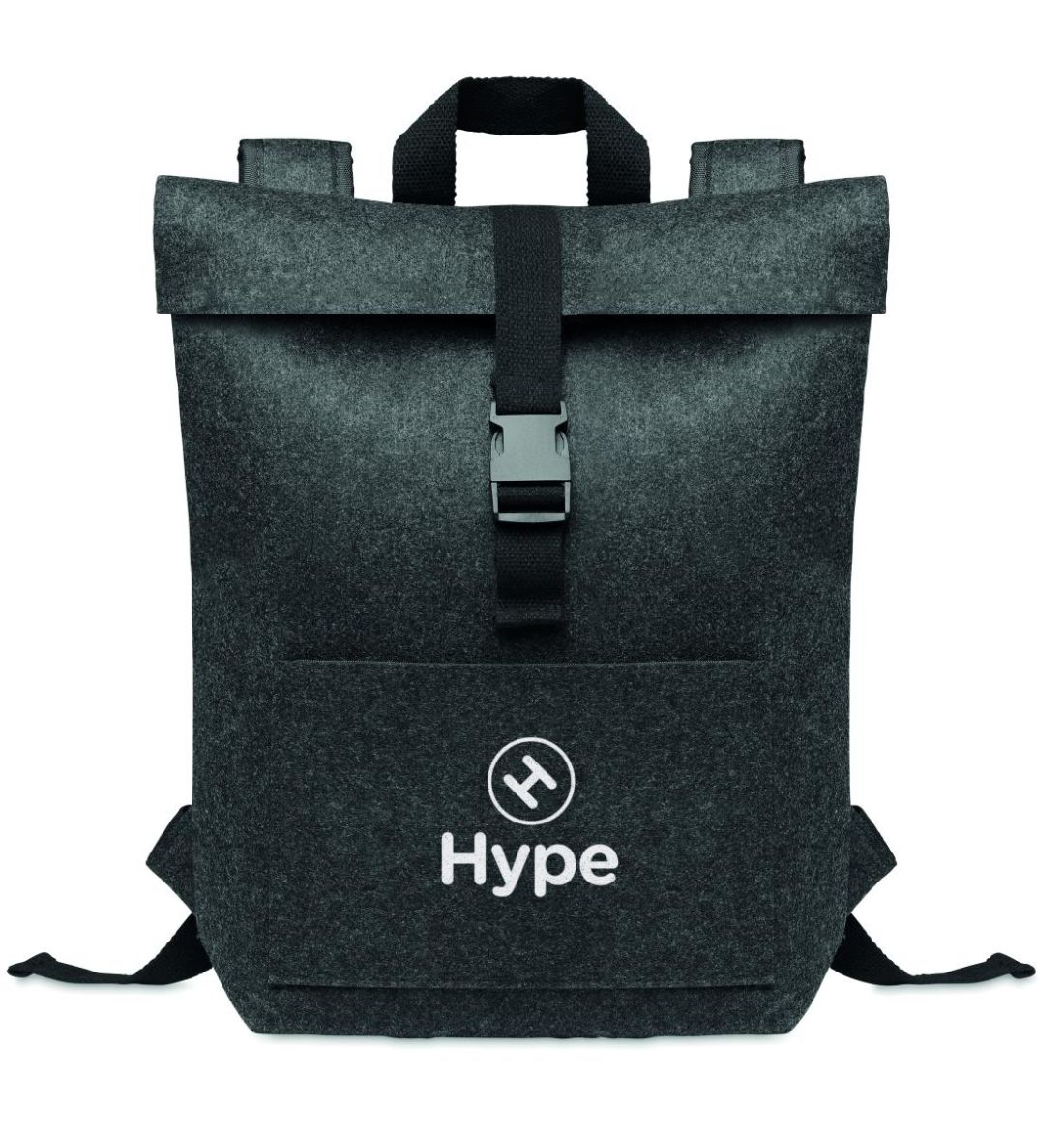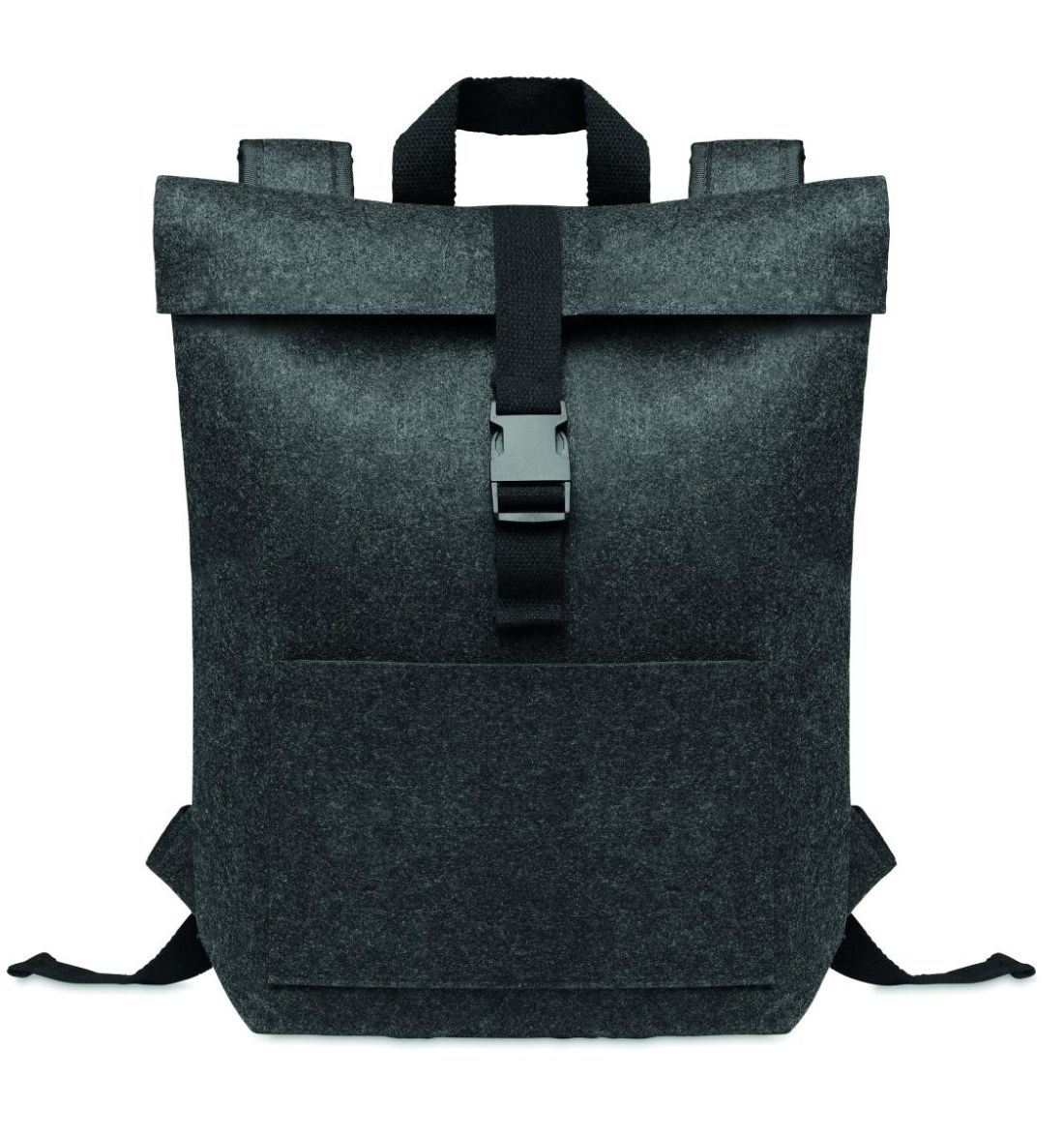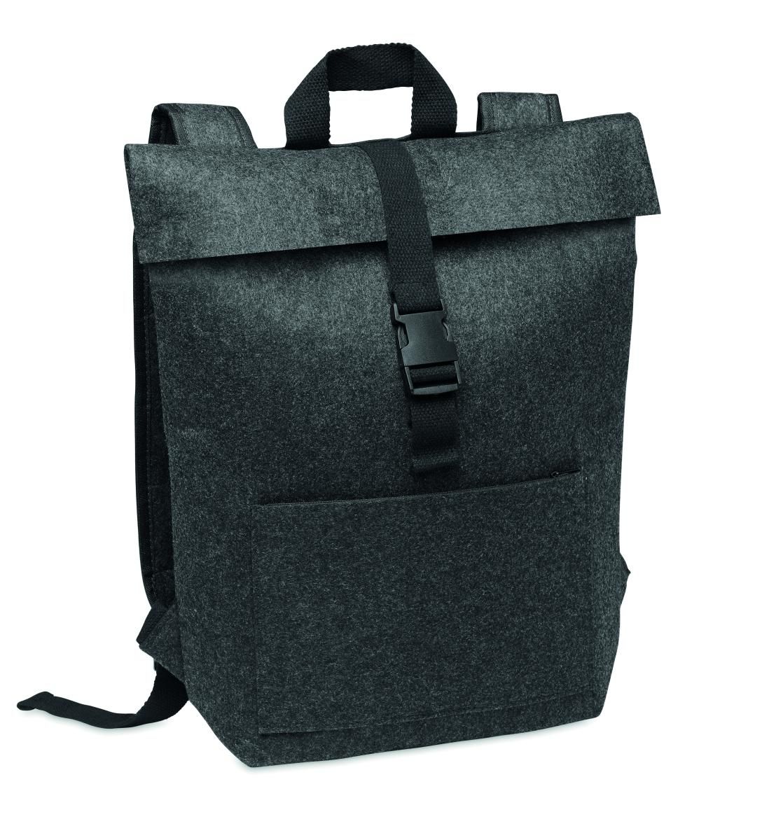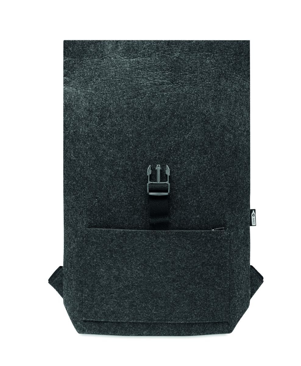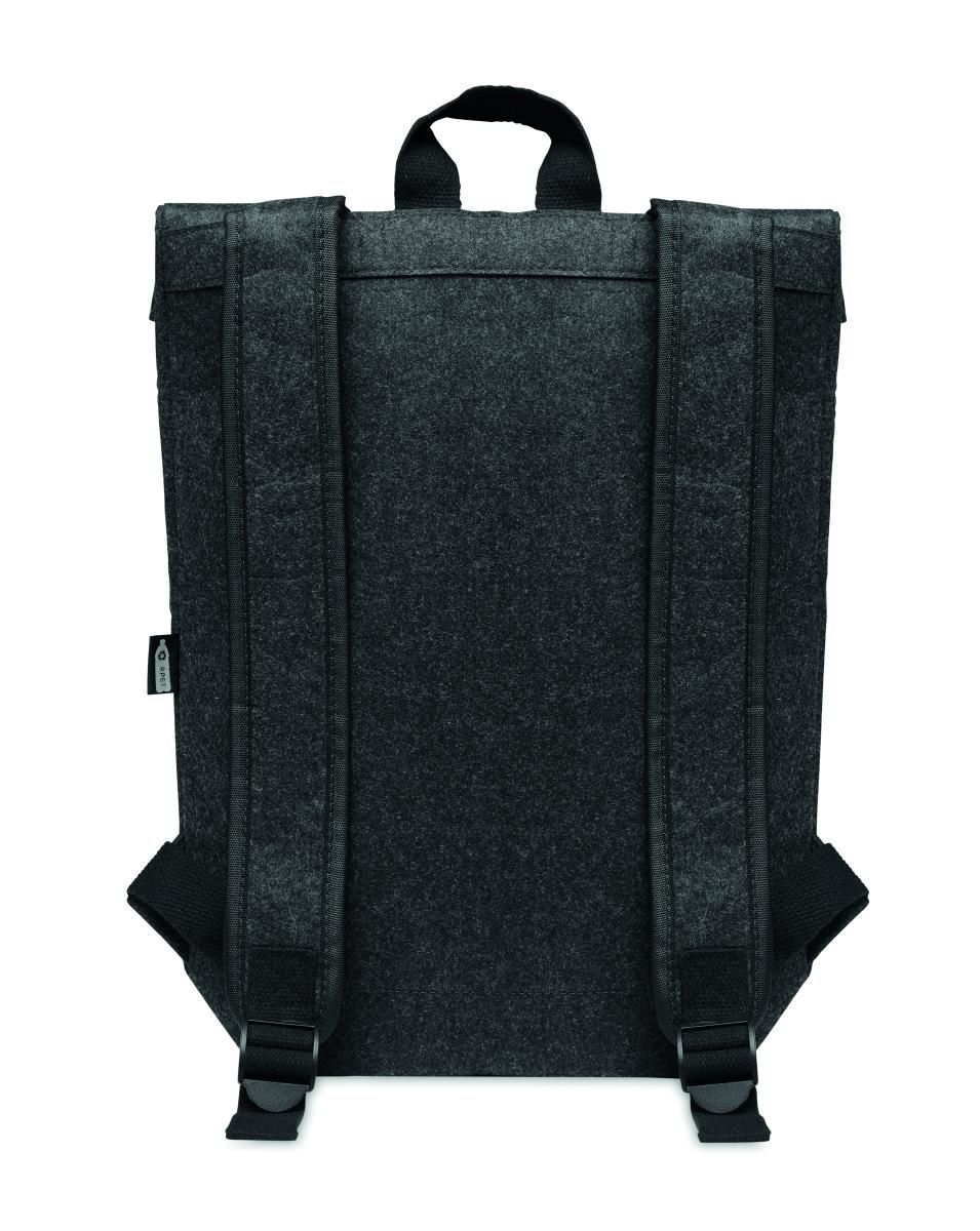 Mochila de fieltro RPET con correa de algodón y bolsillo con cremallera en la parte delantera. Tiene un compartimento para el portátil.
