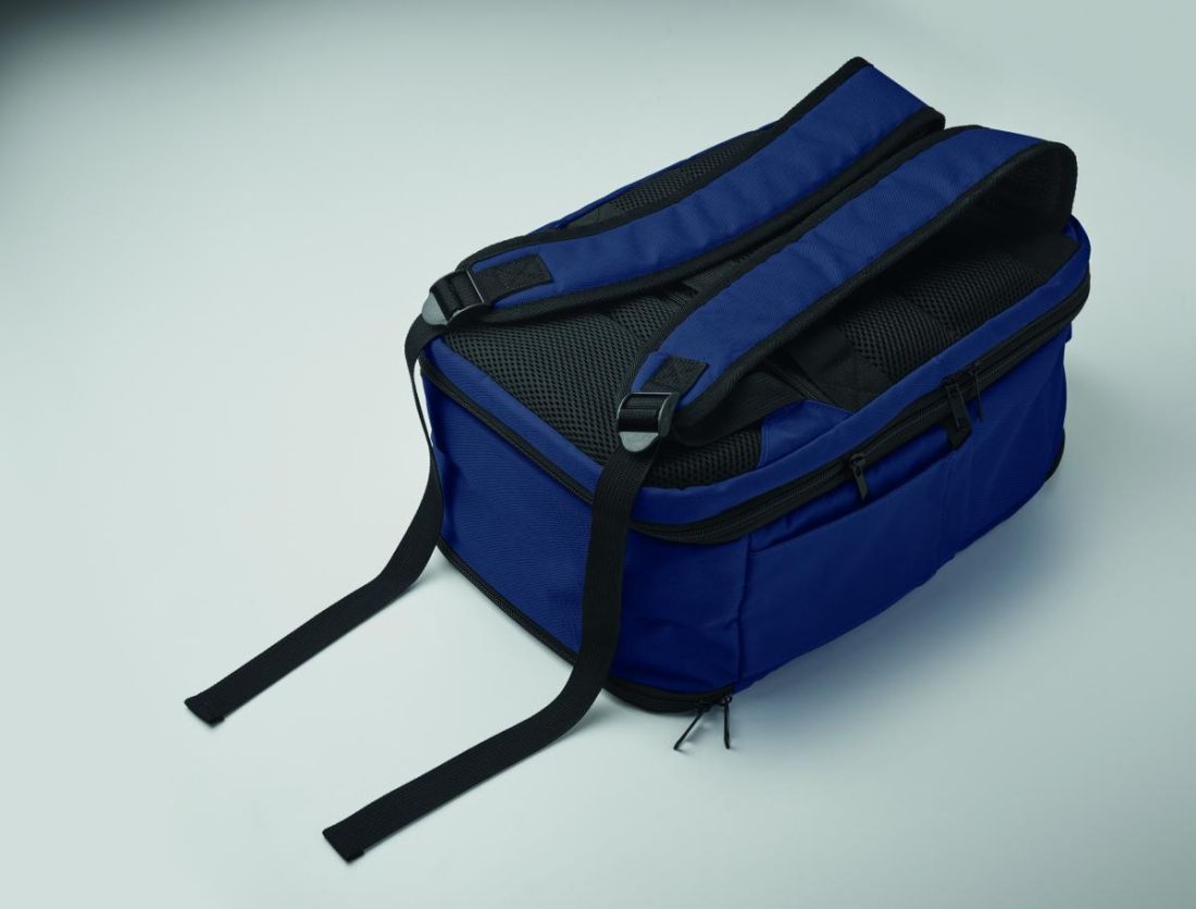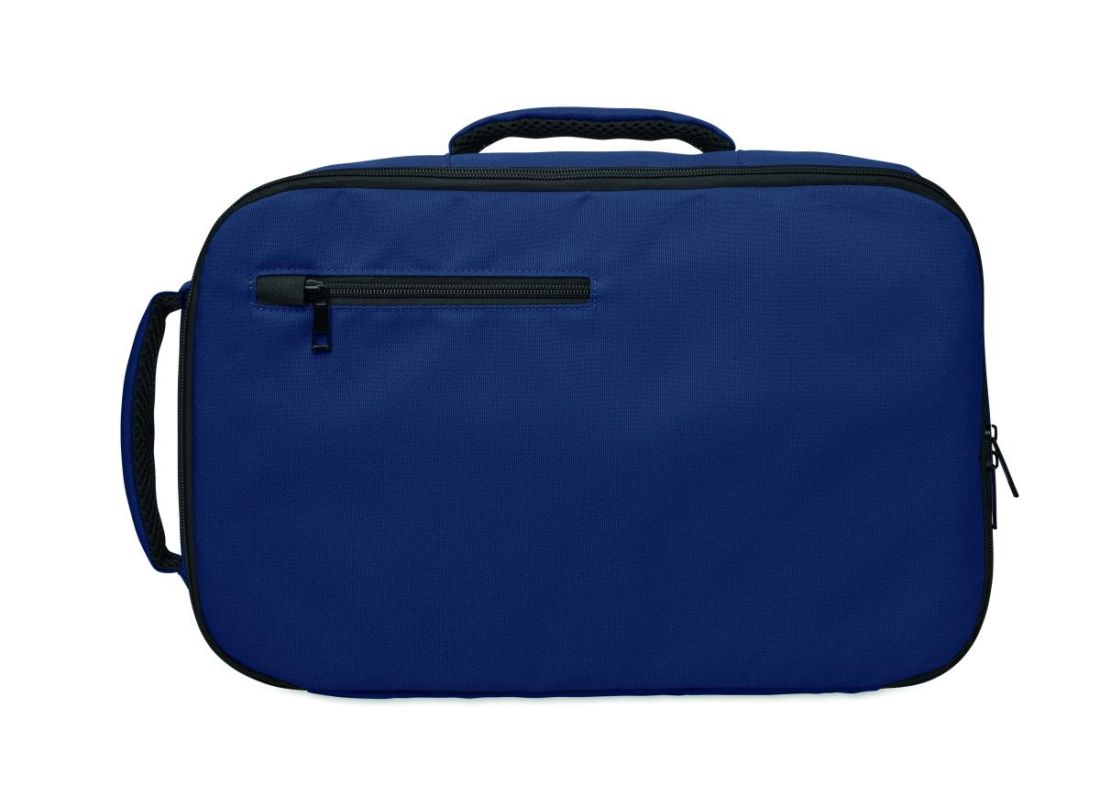 Mochila tamaño cabina en poliéster RPET 600D con apertura de 180º. Compartimento principal con dos secciones abiertas, división de malla, bolsillo acolchado para portátil de 15'' y correa para trolley.