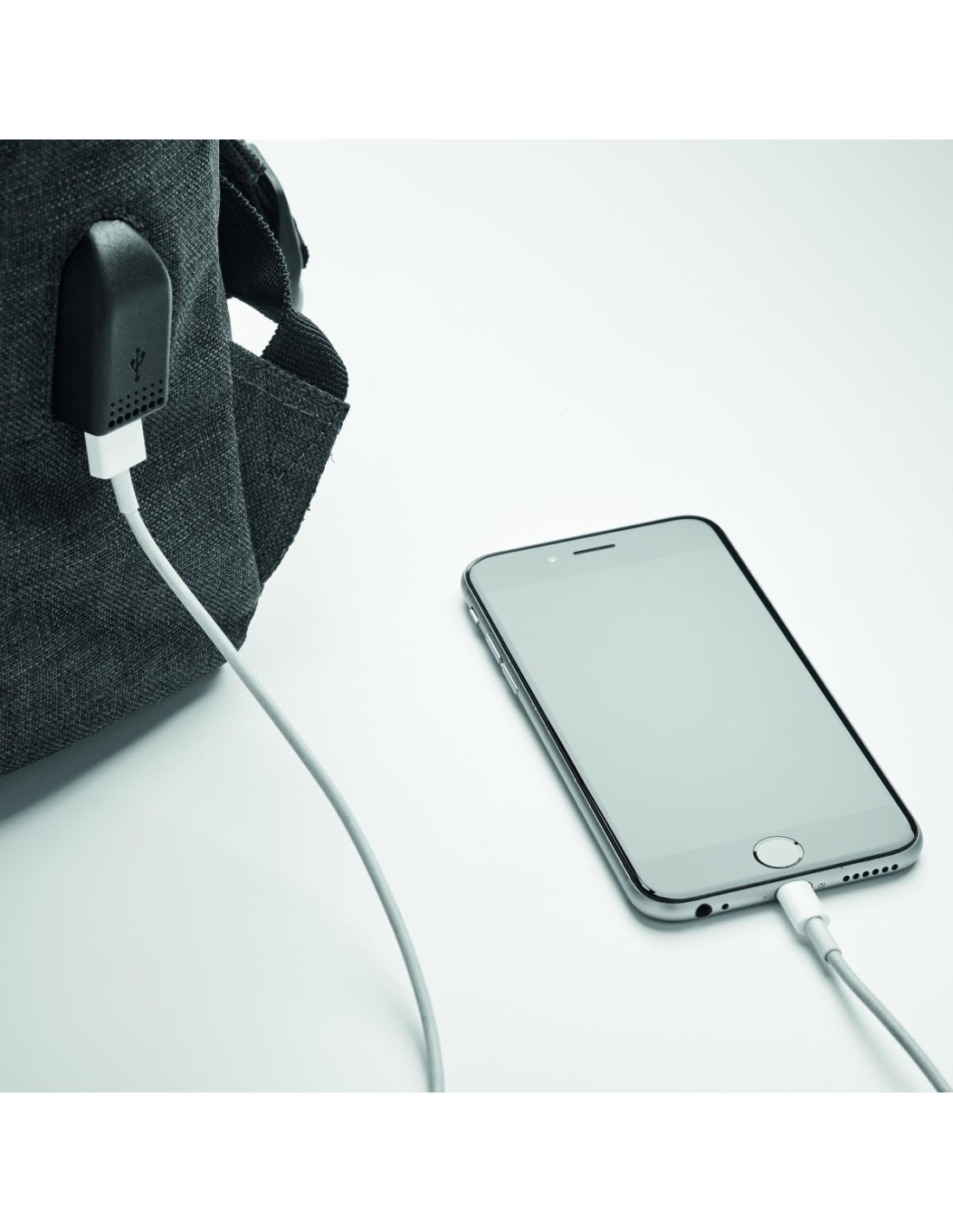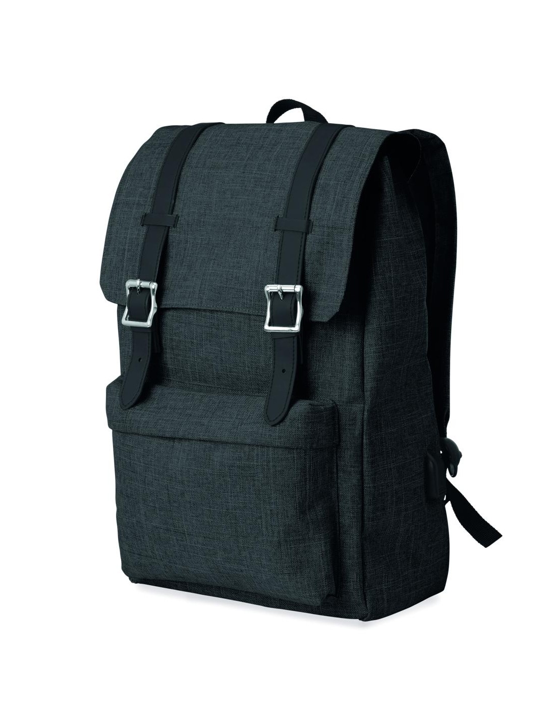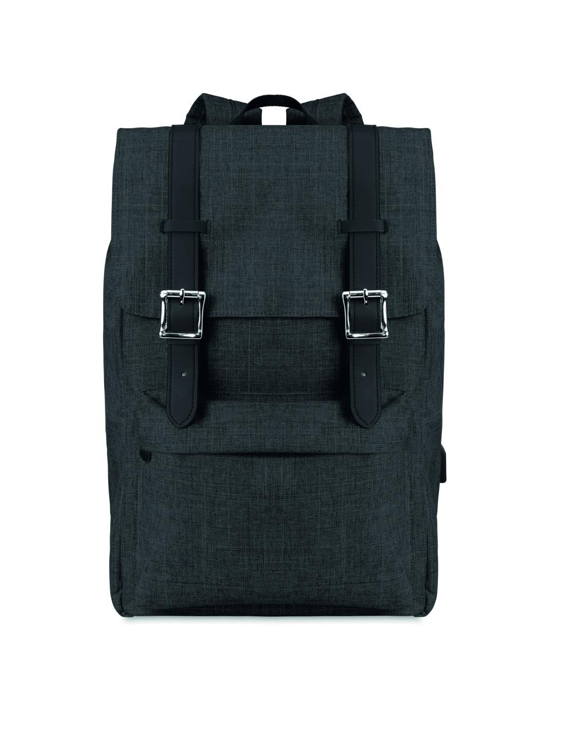 Mochila para portátil de poliéster 600D jaspeada con correa acolchada. Incluye un compartimento principal interno para portátil de 15 pulgadas y un cable de carga USB. Incluye un botón magnético de cierre instantáneo y un compartimento con cremallera en la parte delantera.