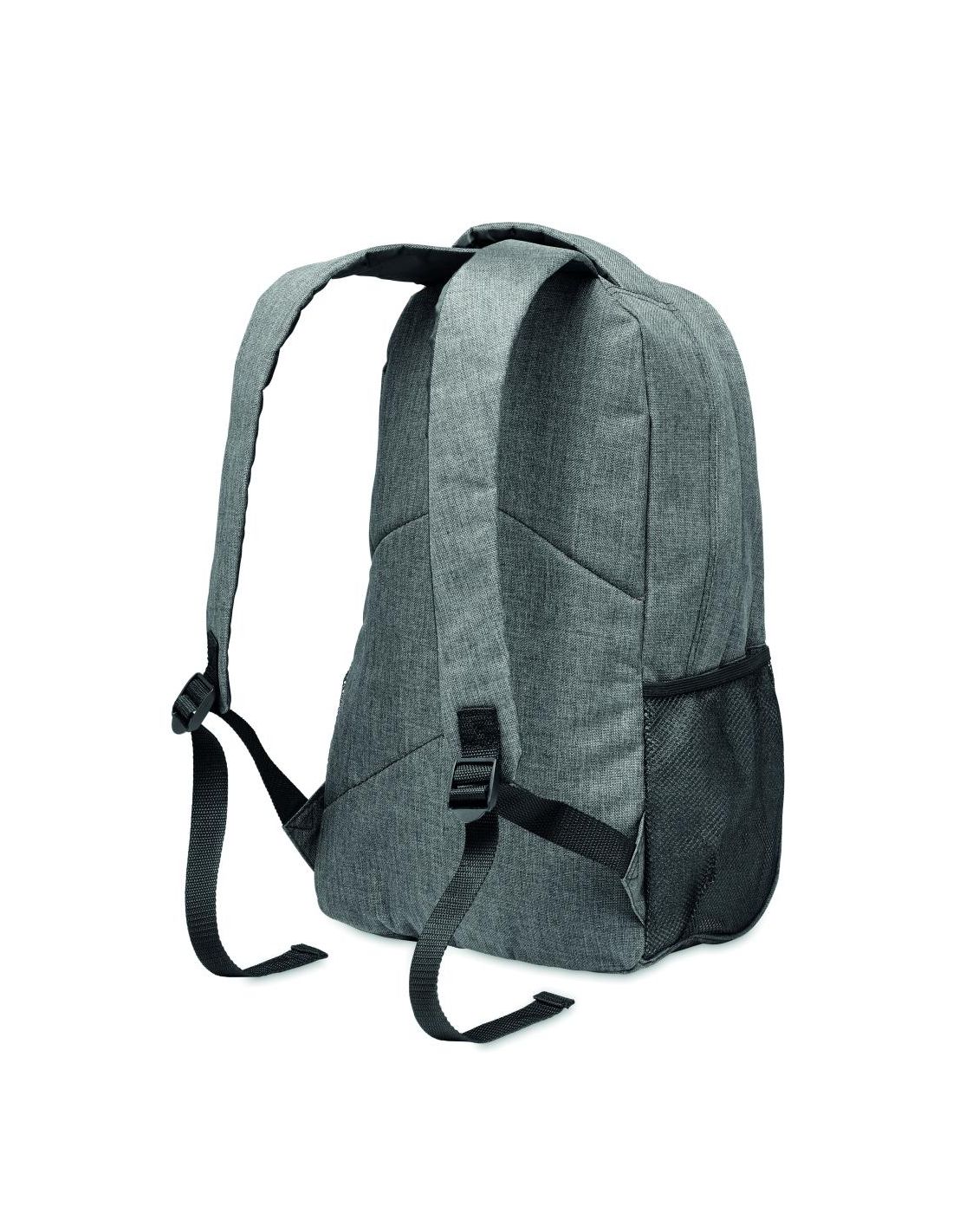 Mochila de poliéster 600D jaspeada con revestimiento de colores contrastantes y cordón decorativo en la parte frontal. Bolsillos de malla en ambos …