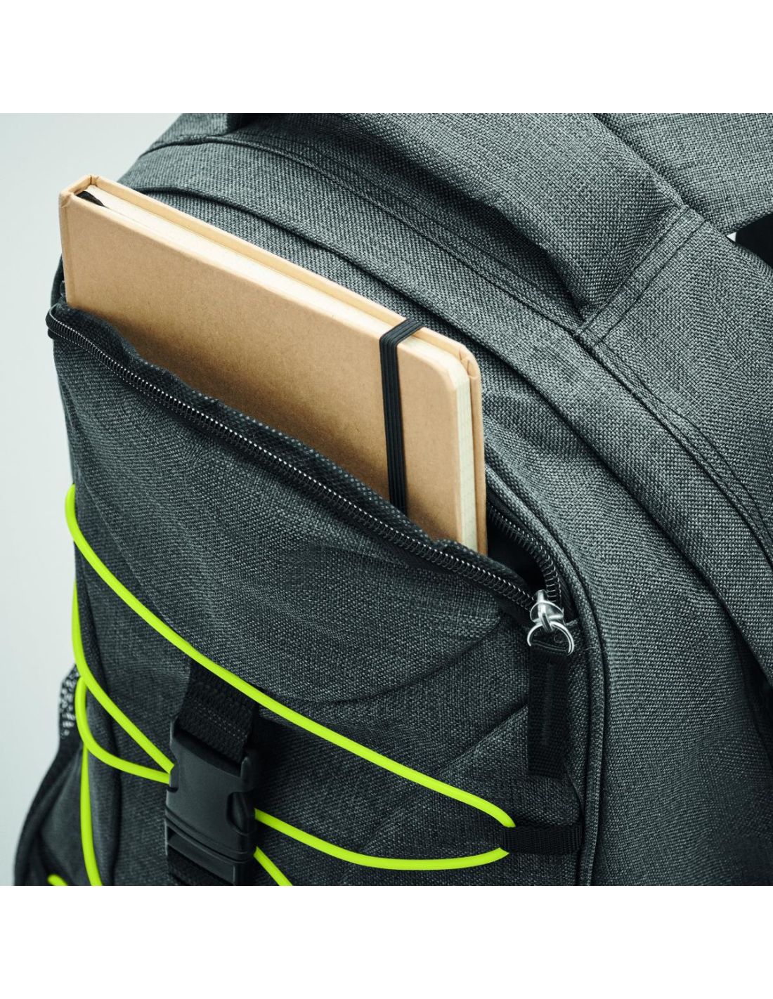 Mochila de poliéster 600D jaspeada con revestimiento de colores contrastantes y cordón decorativo en la parte frontal. Bolsillos de malla en ambos lados.