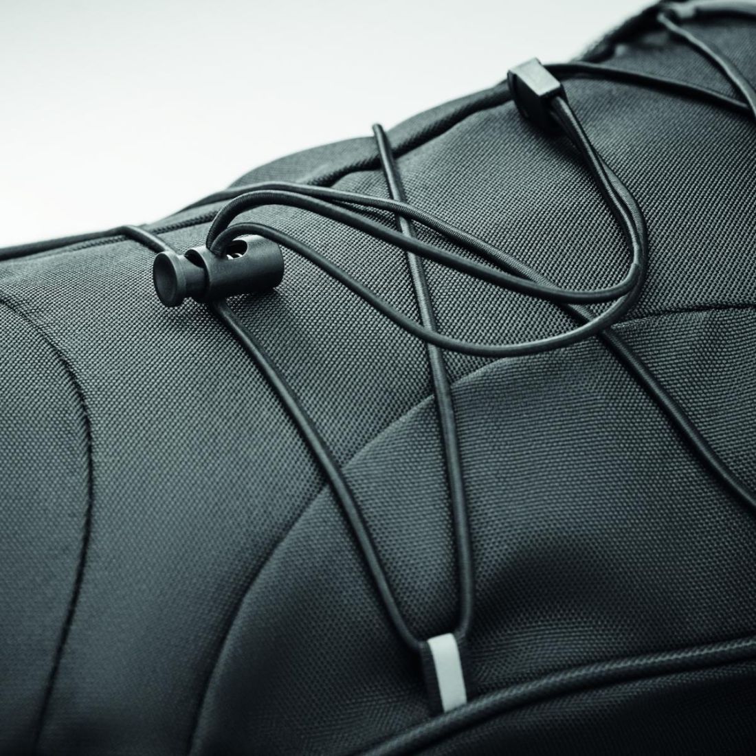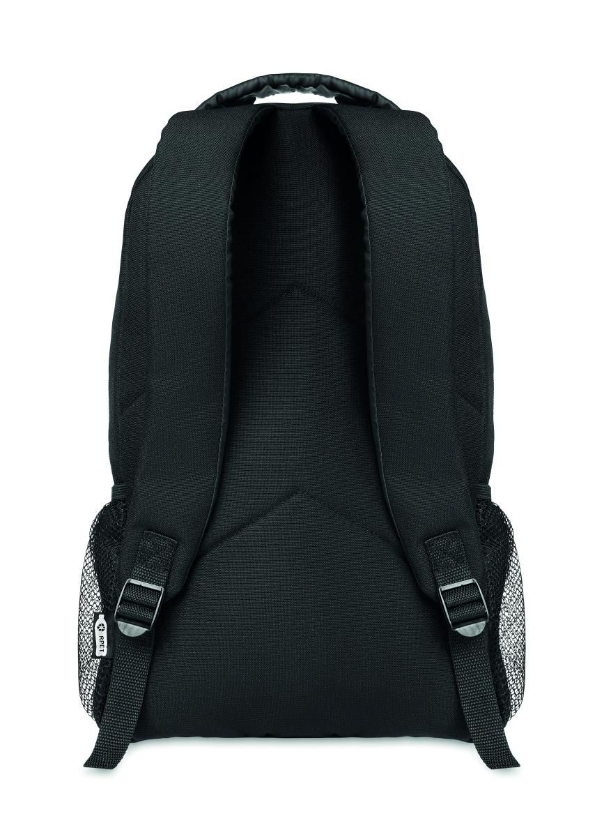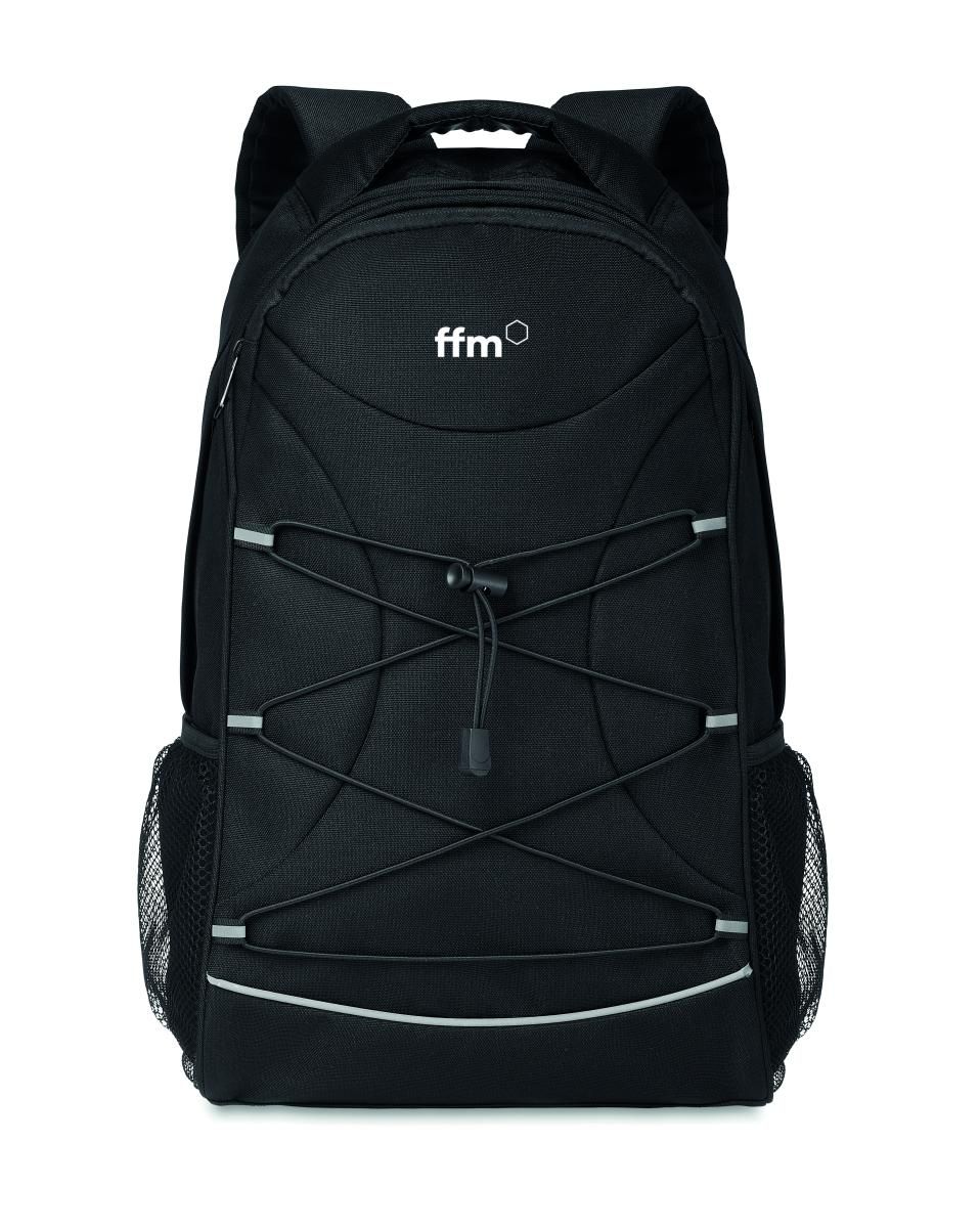 Mochila de RPET 600D jaspeada con revestimiento de colores contrastantes y cordón decorativo en la parte frontal. Bolsillos de malla en ambos lados.
