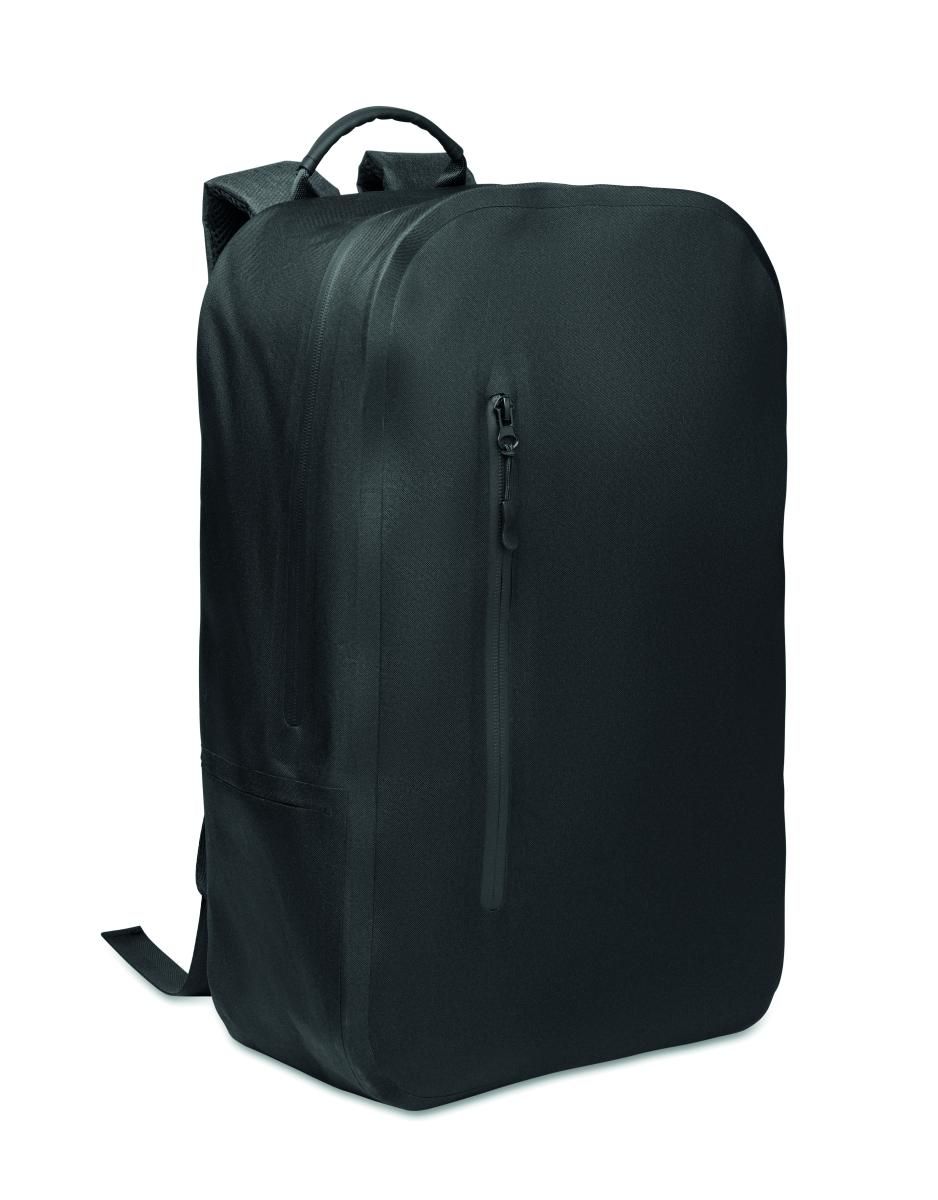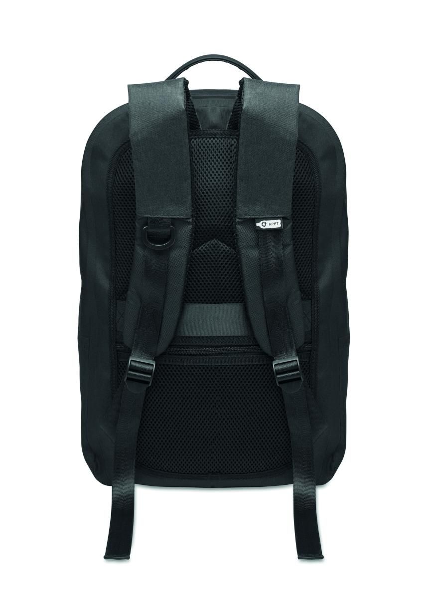 Mochila para portátil de 16'' en poliéster RPET 300D y forro de poliéster 210D. Tejido resistente al agua. Bolsillo oculto con cremallera y soporte para trolley. Compartimento interno acolchado para el portátil, parte trasera de malla y correa para el hombro.
