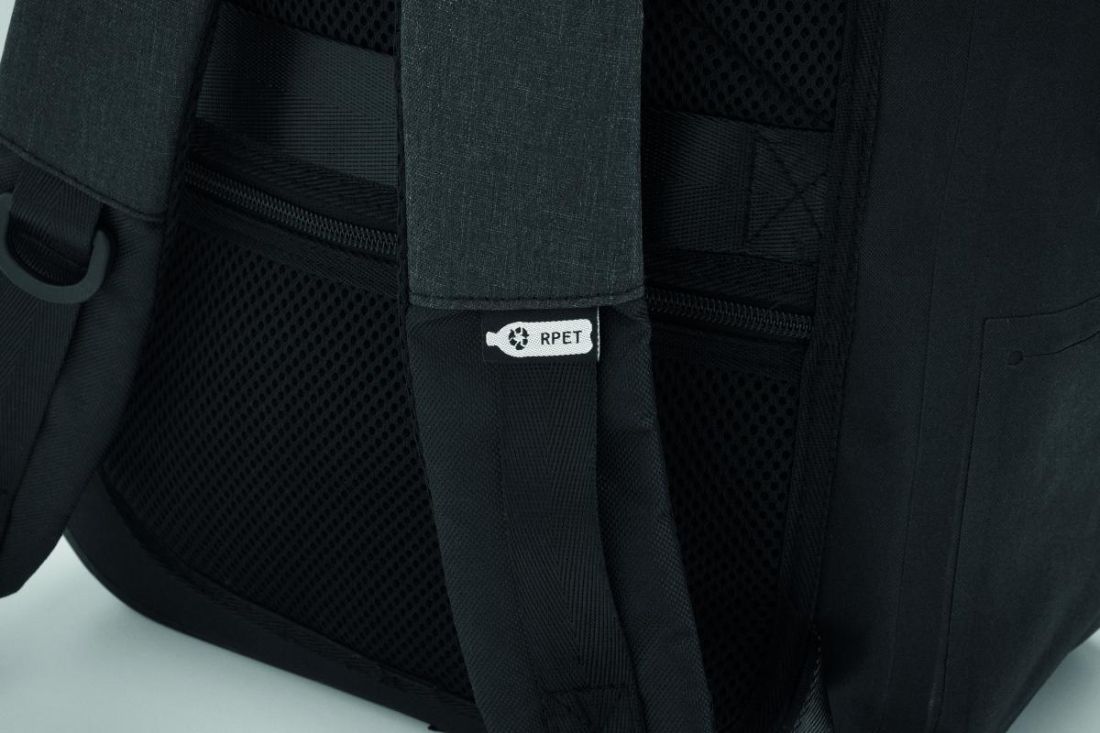 Mochila para portátil de 16'' en poliéster RPET 300D y forro de poliéster 210D. Tejido resistente al agua. Bolsillo oculto con cremallera y soporte…