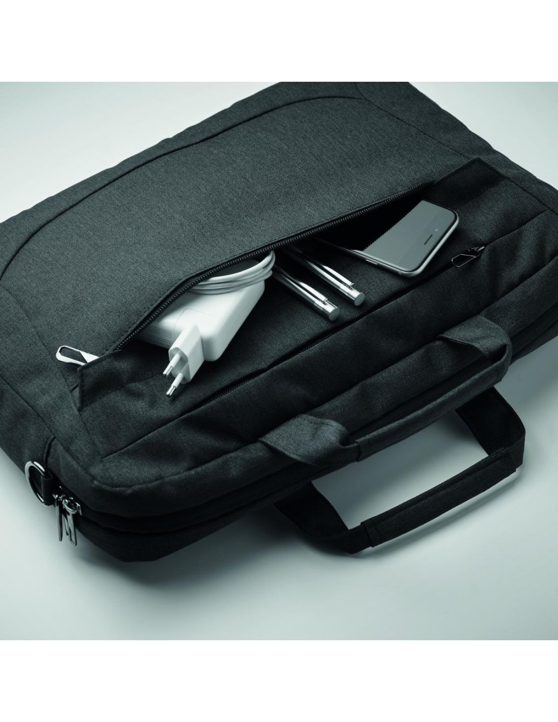 Maletín de ordenador portátil de 15'' en poliéster RPET 600D. 2 compartimentos principales internos tanto para portátil como para tablet y gran bolsillo frontal con cremallera. Dispone de un pequeño bolsillo con cremallera. Tirantes desmontables y ajustables. Soporte para trolley en el reverso.