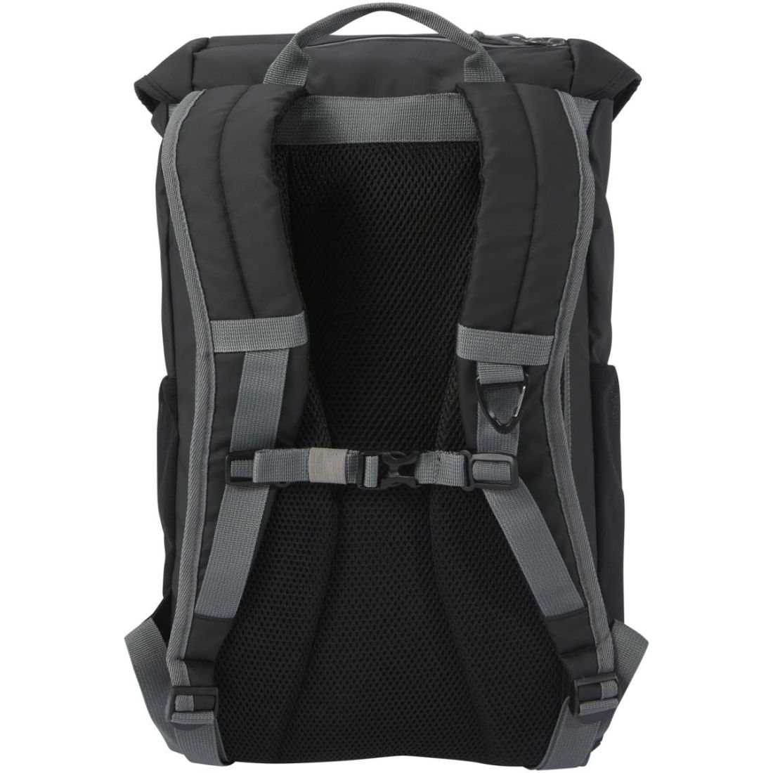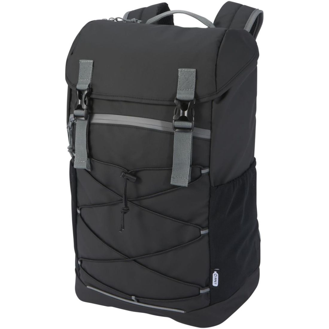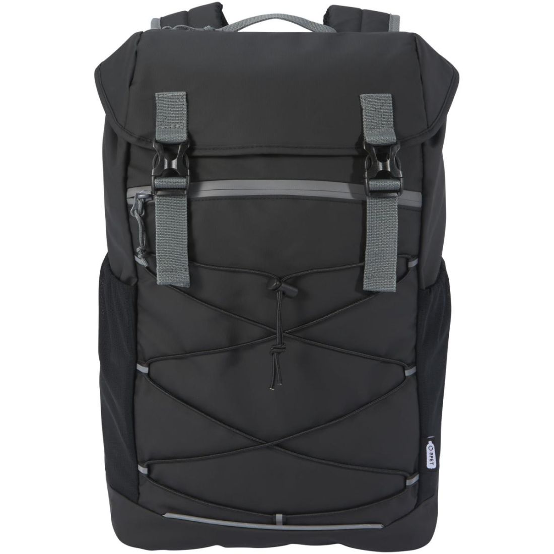 Mochila para portátil resistente al agua fabricada con materiales reciclados con certificado GRS, incluidas las cremalleras. Cuenta con un espacioso compartimento para portátiles de 15,6" con cordón y hebillas ajustables para maximizar el espacio de almacenamiento debajo de la solapa. Esta mochila tiene múltiples bolsillos, incluido uno delantero con cremallera y cordones elásticos para guardar y organizar, así como ribetes reflectantes para mayor visibilidad. El respaldo moldeado y acolchado y la correa ajustable para el pecho hacen que sea cómoda de llevar incluso cuando está completamente cargada. Los materiales reciclados GRS están presentes en el tejido principal, el forro, las correas y las cremalleras. Capacidad: 23 litros. Sin PVC.