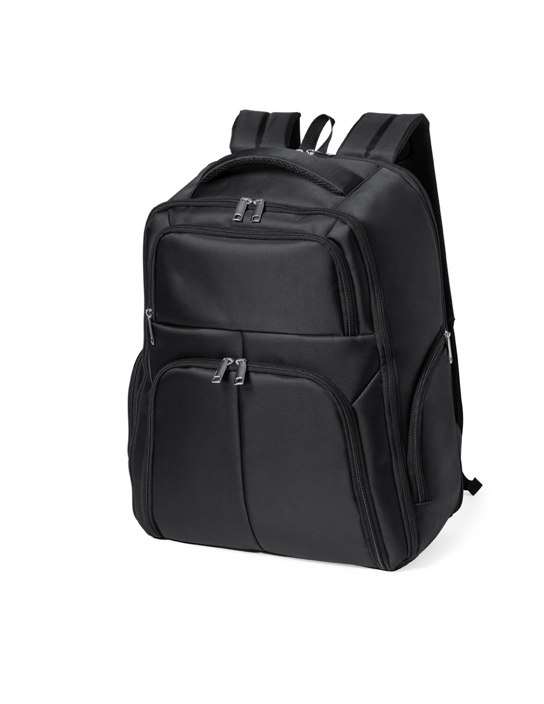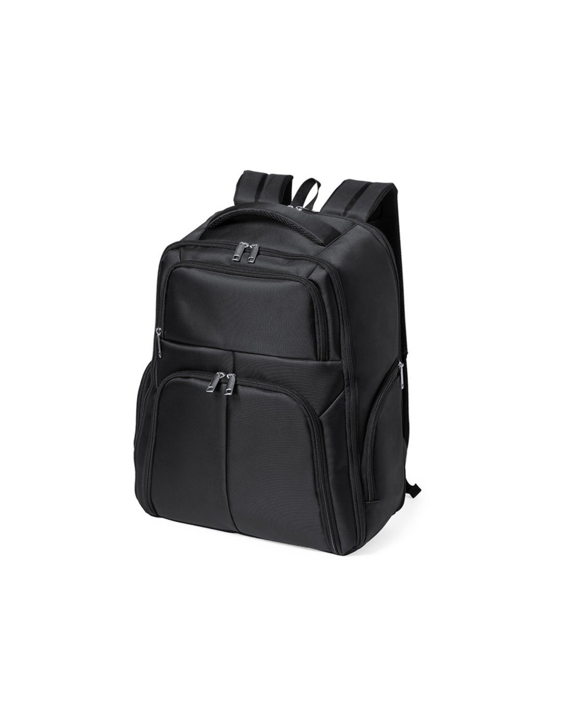 Mochila de calidad premium fabricada en resistente Nyon 600D de acabado en color negro. Compartimento principal con cierre de cremallera a juego y doble tirador. Incluye 3 bolsillos exteriores y 2 bolsillos laterales, todos con cierre de cremallera. Acolchado en asa, parte trasera y cintas para hombros, que además son ajustables. Interior con compartimentos acolchados para ordenador portátil de hasta 17 pulgadas y tablet de hasta 12 pulgadas. Accesorio en espalda para ajuste en trolley.