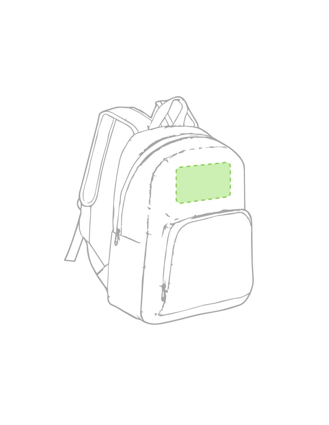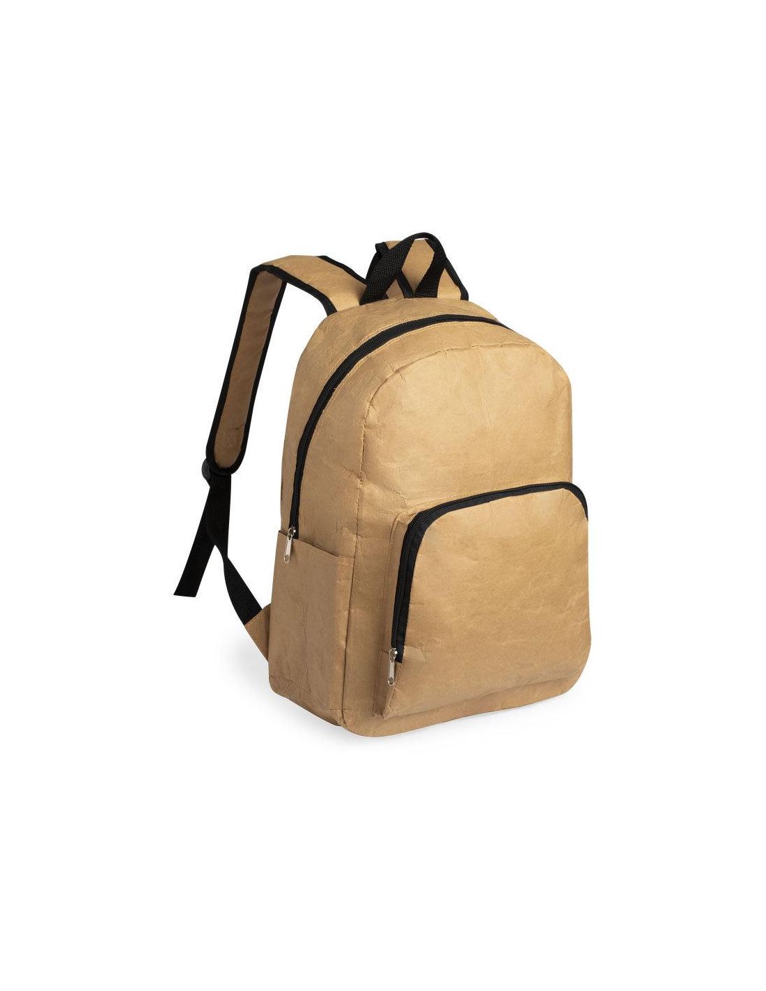 Innovadora mochila en papel laminado ultra resistente de 130 g/m2, resistente a las salpicaduras de agua. Compartimento principal y amplio bolsillo en frontal con cierres de cremallera. Asa de transporte y accesorios en color negro, con cintas de hombros acolchadas y ajustables.