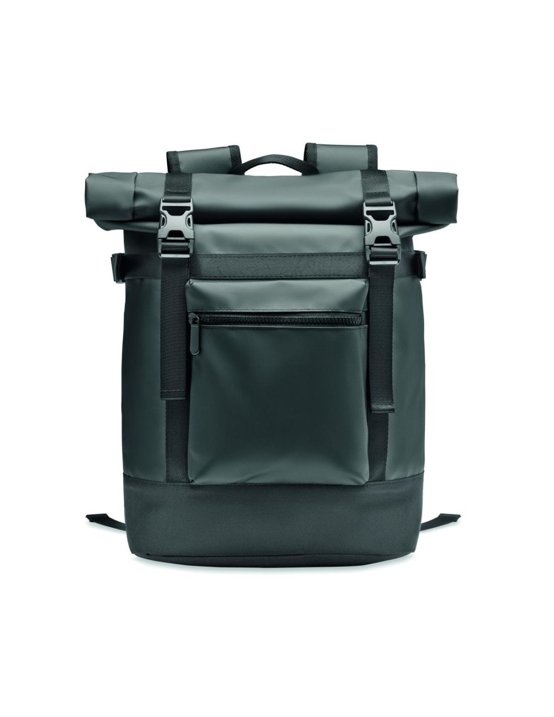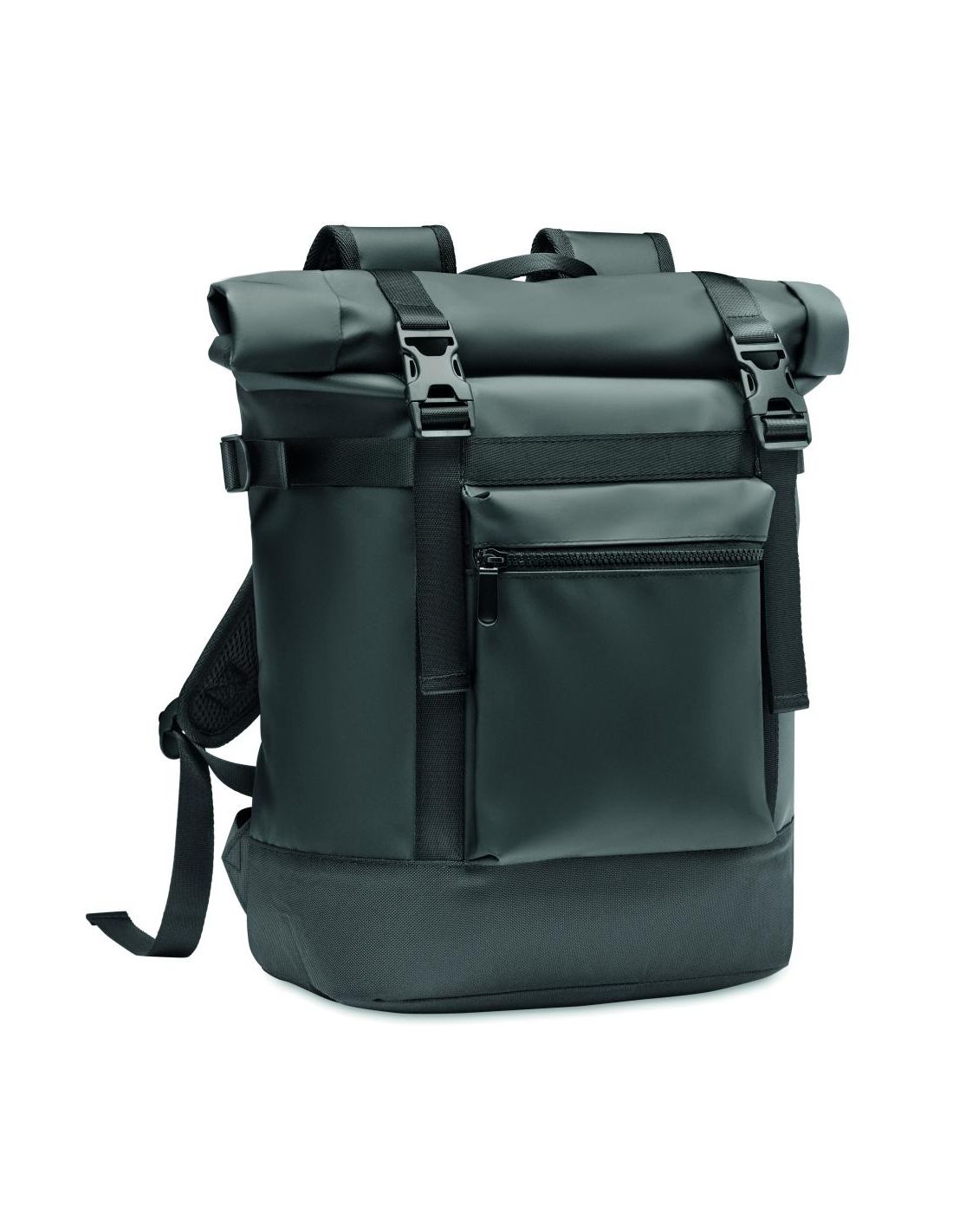 Mochila de lona 50C con cierre roll top con refuerzo acolchado en la espalda, la parte inferior y los tirantes. Bolsillos delanteros con cremallera.