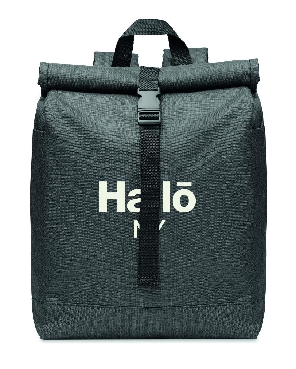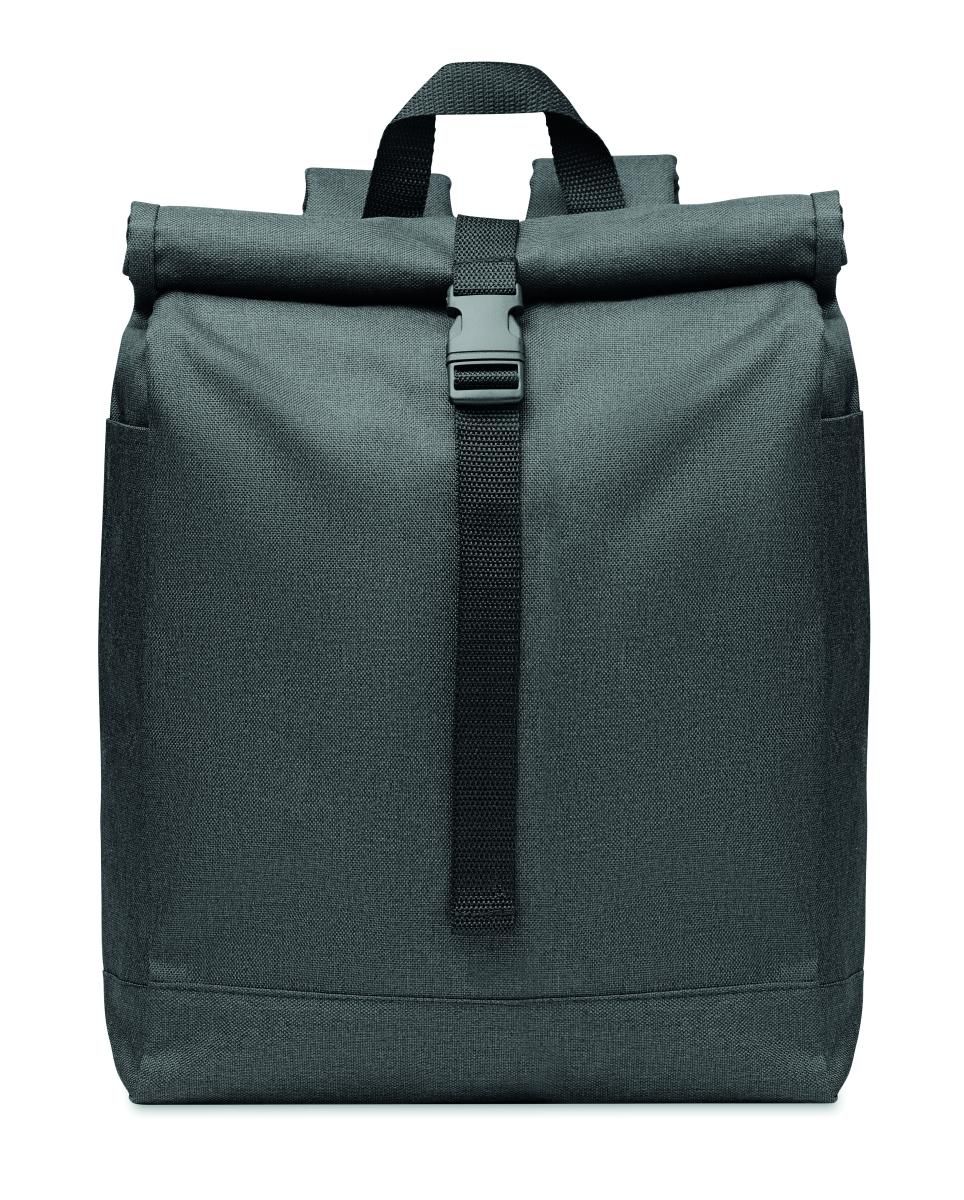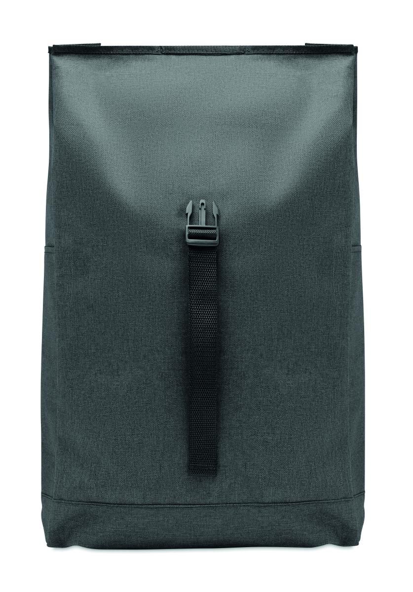 Mochila de poliéster 600D RPET jaspeada con cierre roll top.