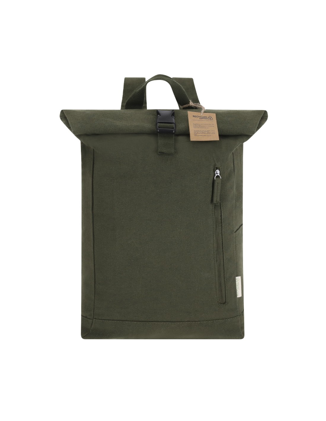 Mochila fabricada en material 100% canvas reciclado. Compartimento principal de gran capacidad con cierre de hebilla de seguridad y velcro, incluyendo un bolsillo frontal con cierre de cremallera invisible. Bolsillo lateral abierto de rápido acceso y asa superior. Con cintas para los hombros ajustables y etiqueta exterior con logotipo Algodón Reciclado.