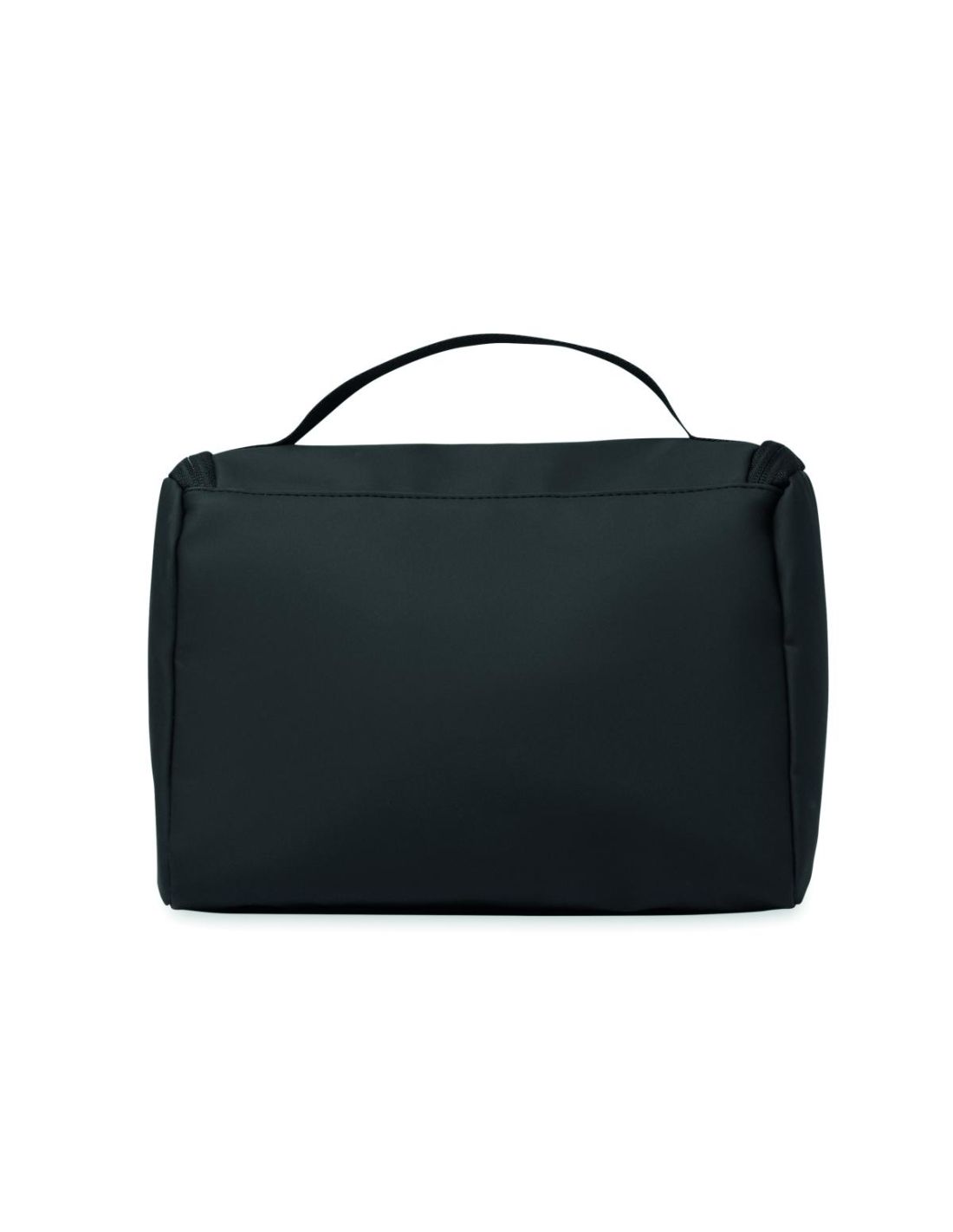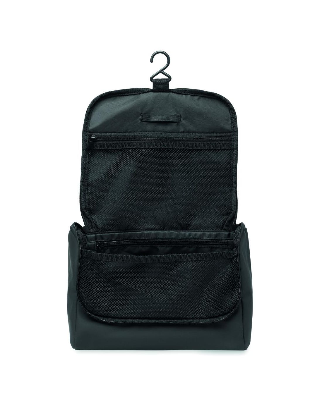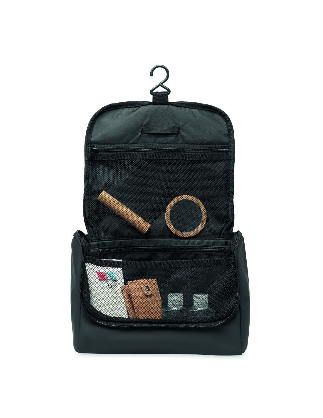 Neceser organizador en suave PU con gancho para colgar y forro de RPET 210D. Un compartimento principal grande con compartimento interior de malla con cremallera y 1 compartimento de malla.