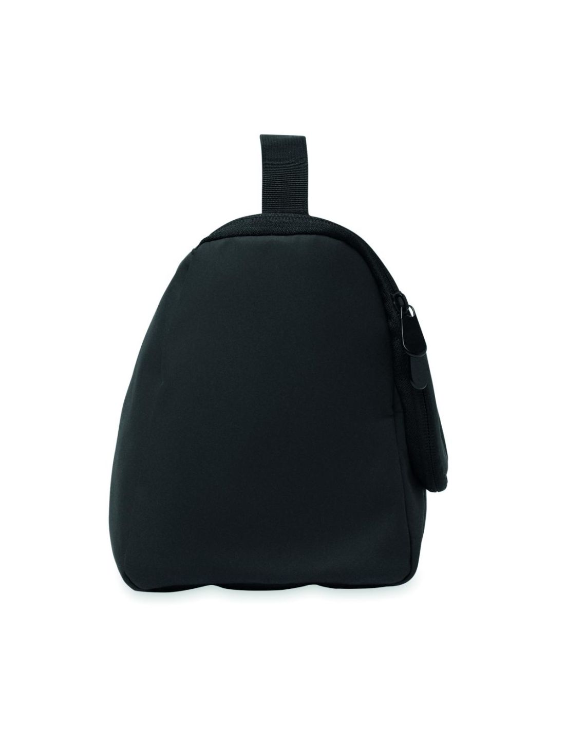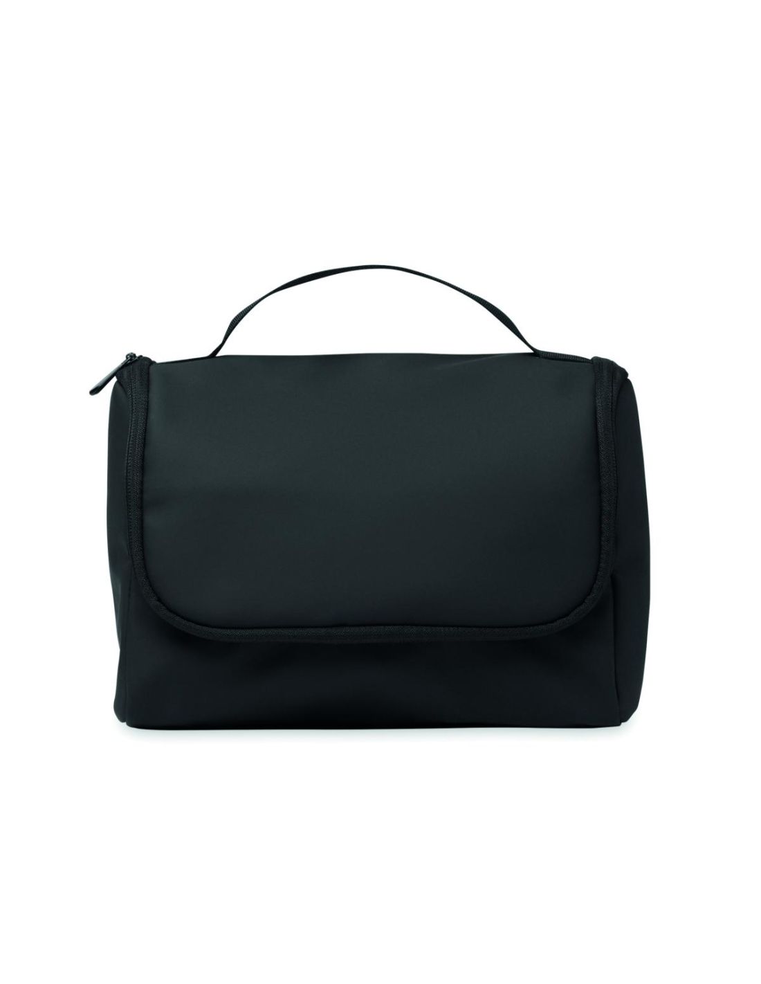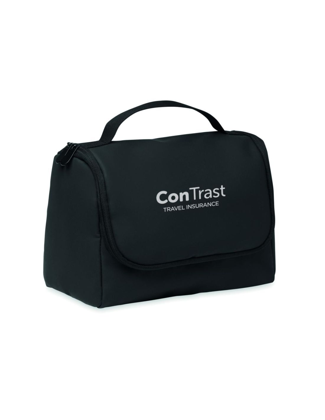 Neceser organizador en suave PU con gancho para colgar y forro de RPET 210D. Un compartimento principal grande con compartimento interior de malla con cremallera y 1 compartimento de malla.