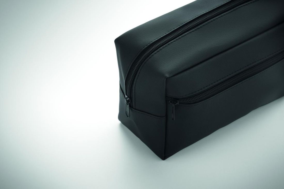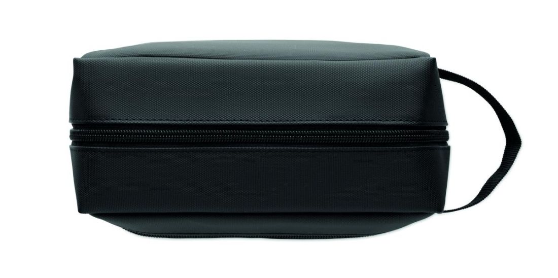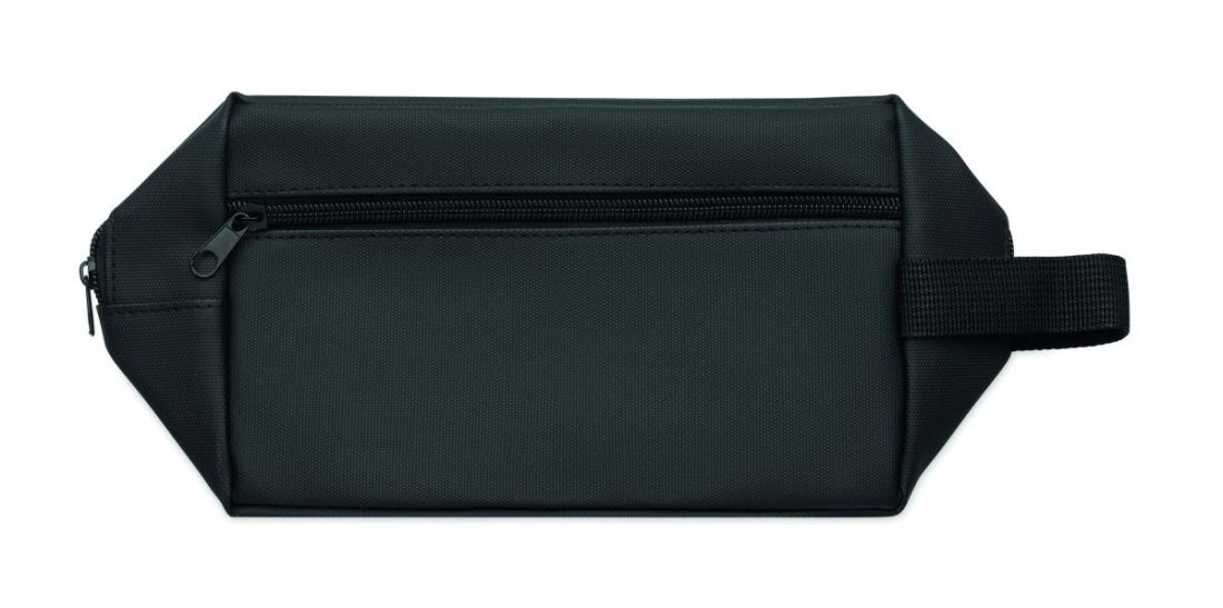 Neceser fabricado en poliéster RPET 600D con revestimiento de PU y forro RPET 210D. Dispone de bolsillo frontal con cremallera y asa.