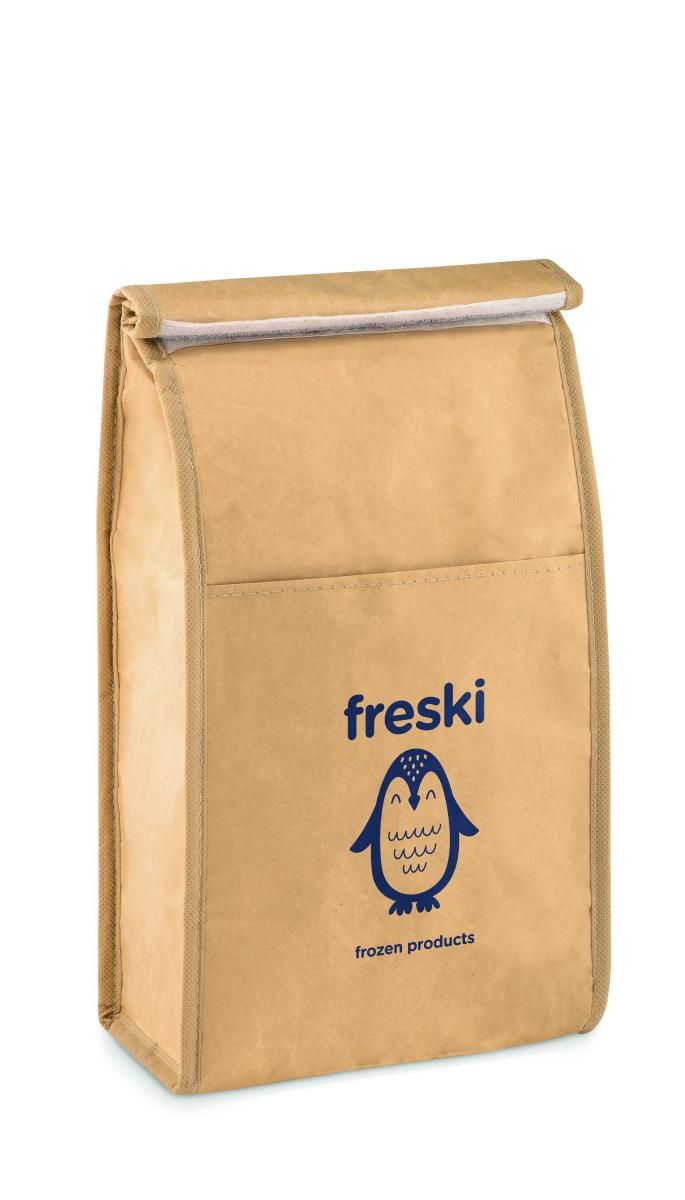 Bolsa de almuerzo nevera de papel reciclado tejido con bolsillo frontal. Material aislante: Capa de espuma de PE. Capacidad 3L.
