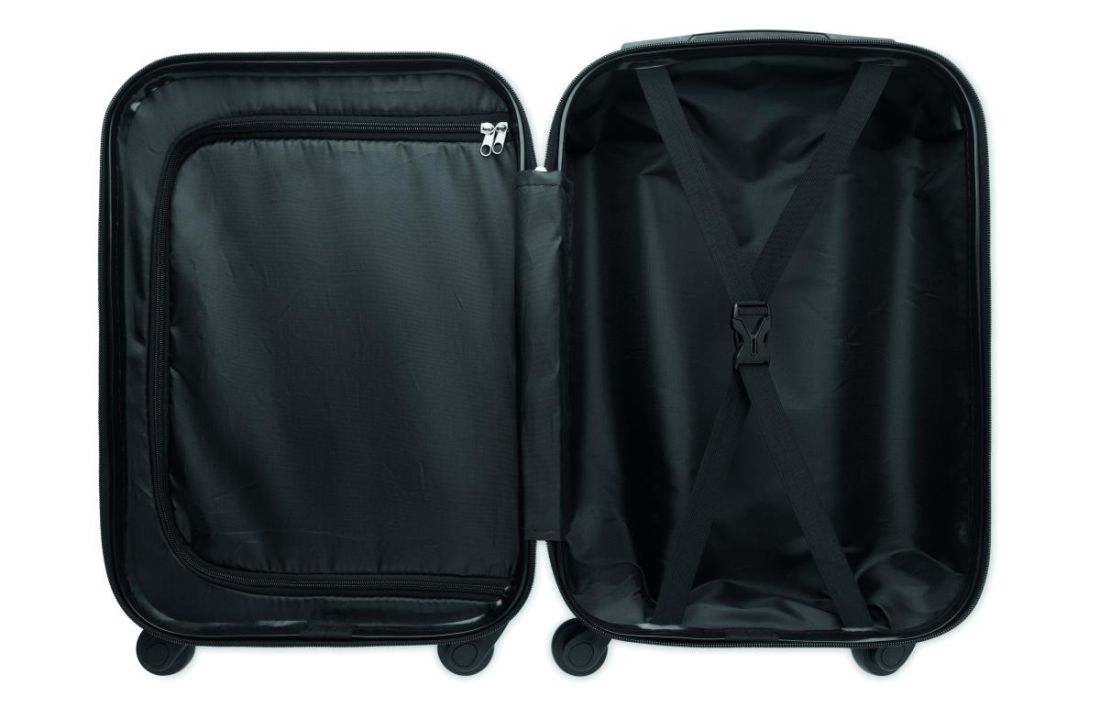 Trolley rígido de 18 pulgadas en ABS. 1 compartimento principal y compartimento interior. Incluye cerradura de seguridad. Se desplaza sobre 4 ruedas.