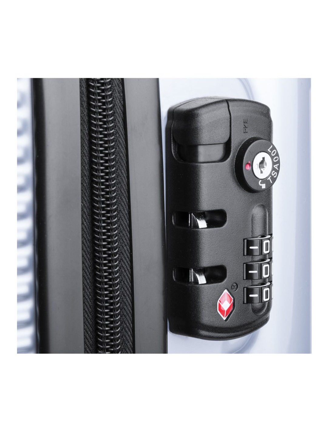 Trolley de negocios rígido en resistente material en acabado plateado. De apertura total, con 4 ruedas giratorias y cierre de seguridad por contraseña. Cierre conforme a los estándares TSA -Administración de la Seguridad en el Transporte-, que permite a las autoridades de aduanas inspeccionar el contenido del equipaje sin tener que forzar o romper el cierre, a traves de una llave especial a disposición de la autoridad. Compartimento principal con cierre de cremallera de doble tirador y doble asa de mano. Interior forrado, con bolsillo acolchado para ordenador portátil de hasta 17 pulgadas.