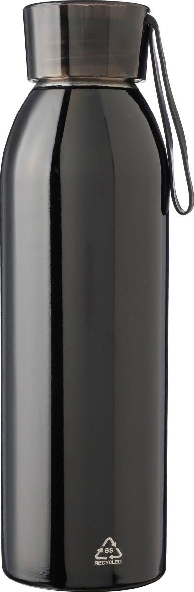 Botella de acero inoxidable reciclado 304 (650 ml) con tapa de PS y correa de silicona. Presentada en una caja de cartón marrón.