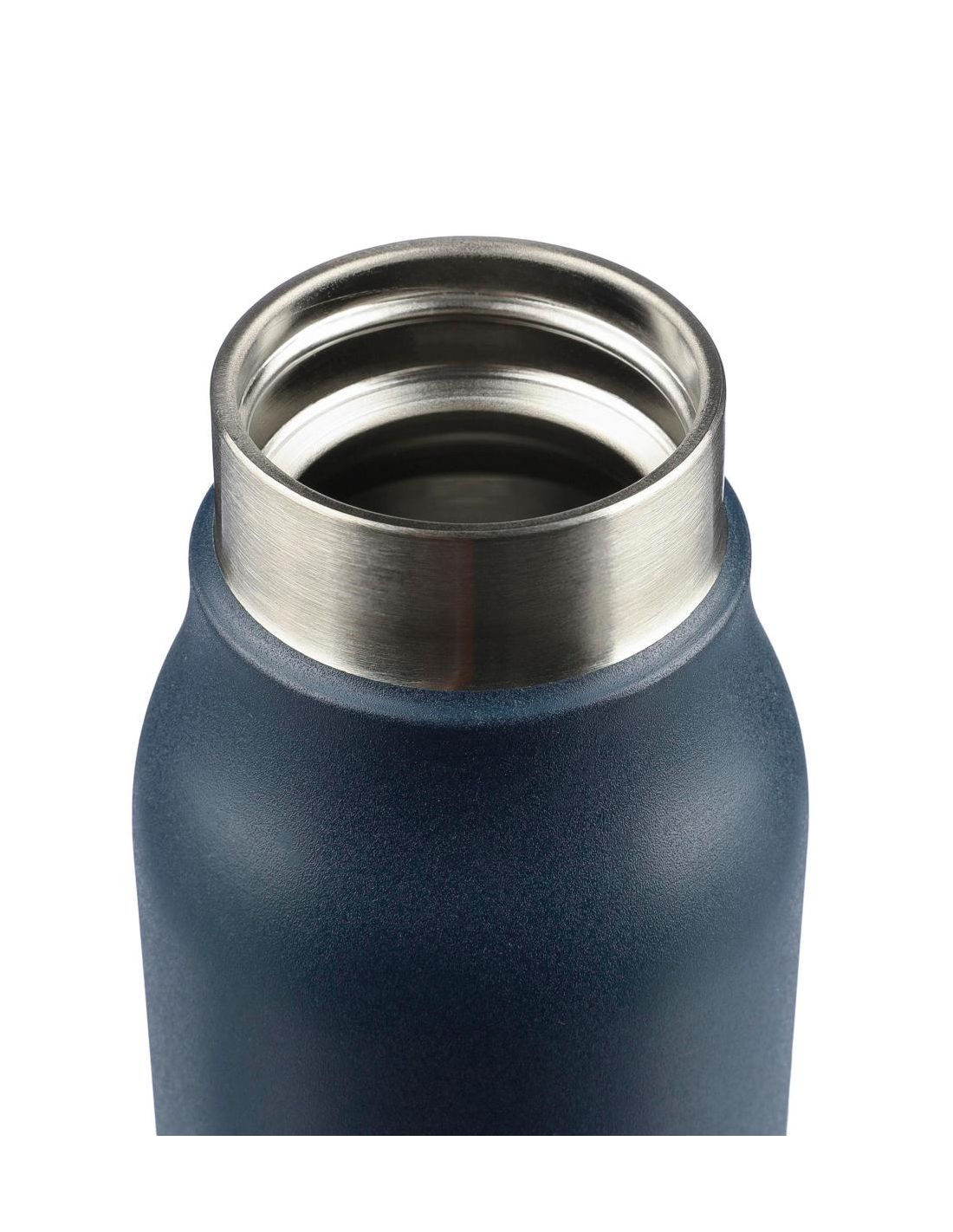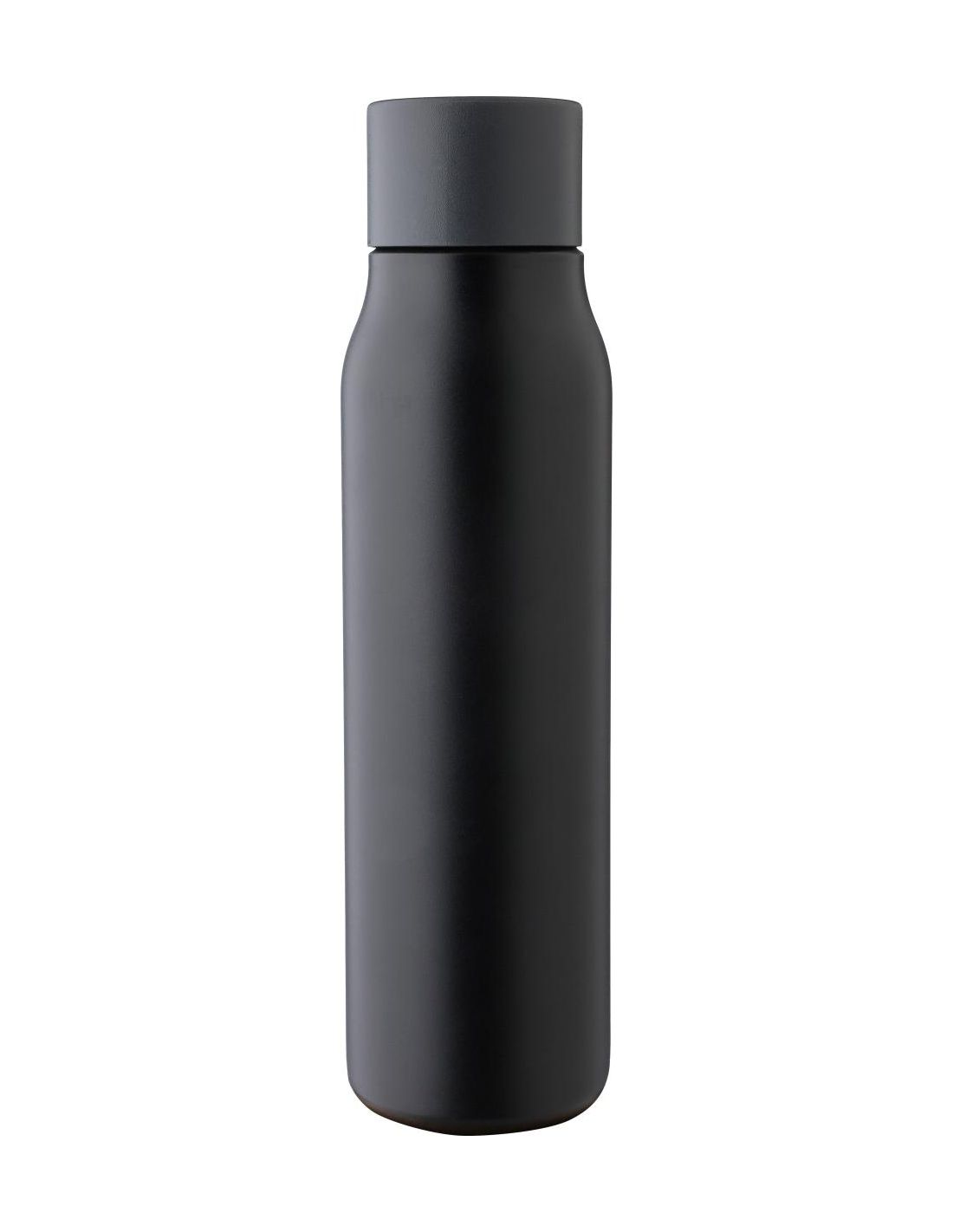Botella de acero inoxidable reciclado (600 ml). Interior acero inoxidable 304 y exterior en acero inoxidable 201. Cuenta con una tapa de PP negra a prueba de fugas con un mosquetón de aluminio y una cinta de transporte. El mosquetón no es apto para escalar. Mantiene las bebidas calientes durante 6 horas o frías durante 9 horas. Incluye un logotipo indicando que es material reciclado. Presentada en una caja de cartón marrón. Evitar bebidas ácidas o con gas