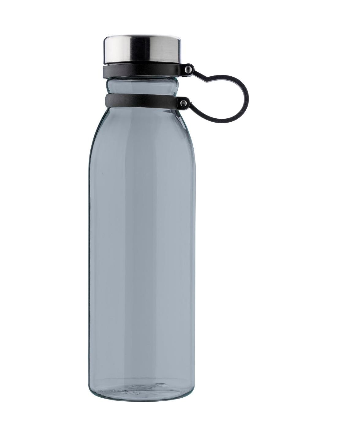 Botella de rPET (750 ml). La correa de silicona mantiene la tapa de acero inoxidable unida a la botella. Recomendable para uso de agua fría. Evitar bebidas ácidas o con gas.