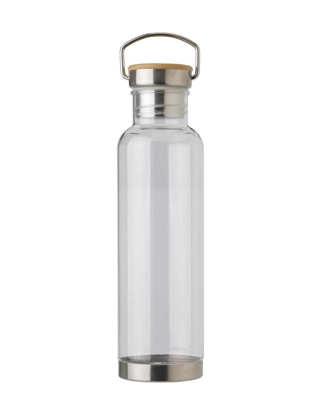 Botella de tritan (800 ml) con fondo y tapón de rosca de acero inoxidable con aplicación de bambú y asa. Presentada en una caja de cartón marrón. Recomendable para uso de agua fría. Evitar bebidas ácidas o con gas.