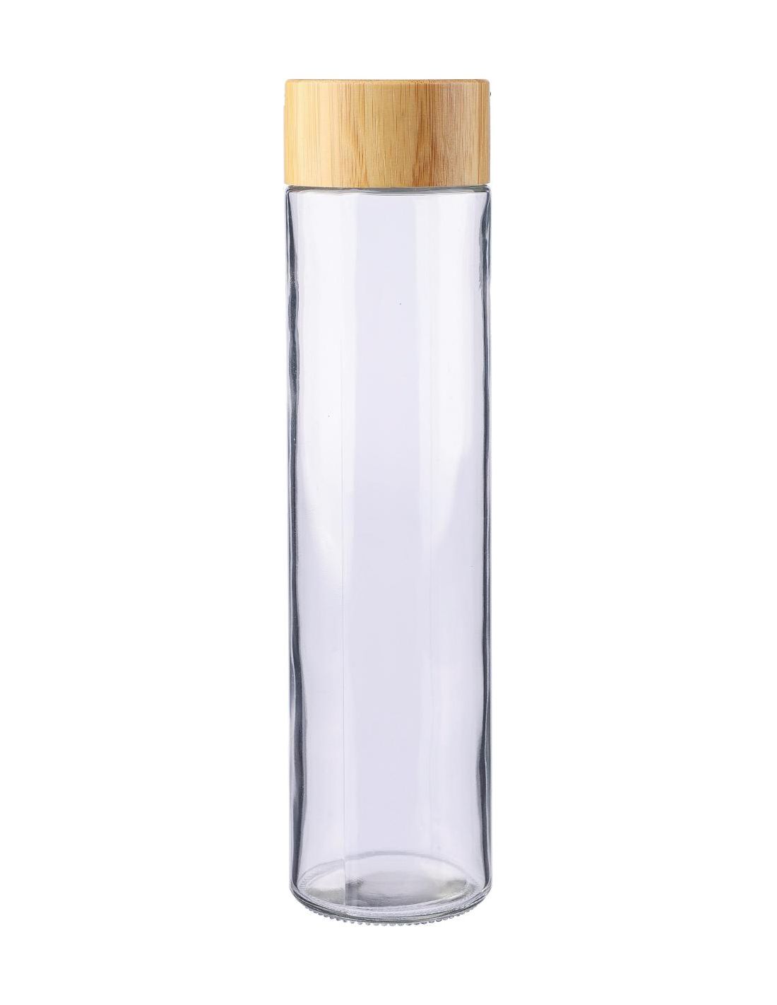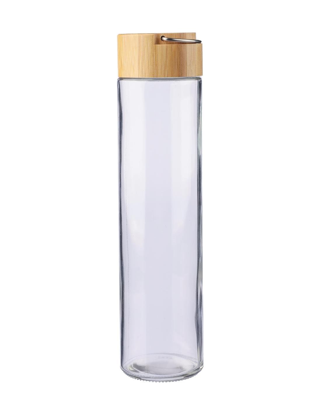 Botella de vidrio (500 ml) con tapa de bambú y asa de metal. Presentada en una caja de cartón marrón. Evitar bebidas ácidas o con gas.