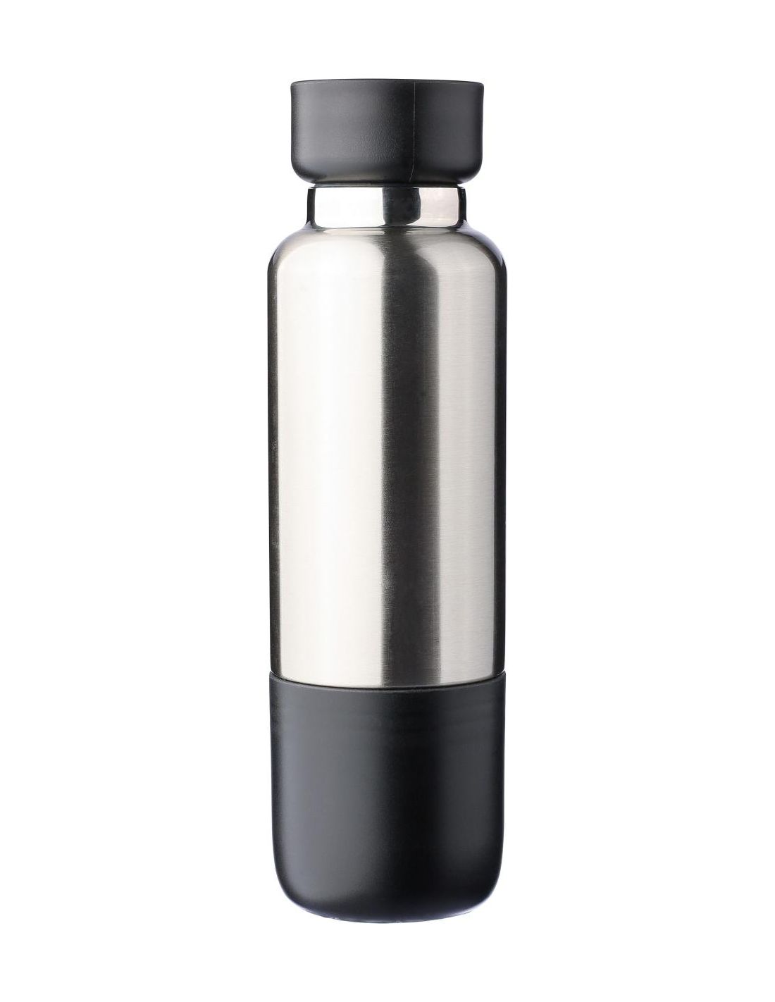 Botella termo de acero inoxidable de doble pared (500 ml) . Interior acero inoxidable 304 y exterior 201. Cuenta con tapa de rosca de PP con compartimento transparente de AS, correas de muñeca y de transporte de poliéster intercambiables, y un vaso de PP de 200 ml en la base. Cuerpo plateado y detalles en color mate. Presentada en una caja de cartón marrón.