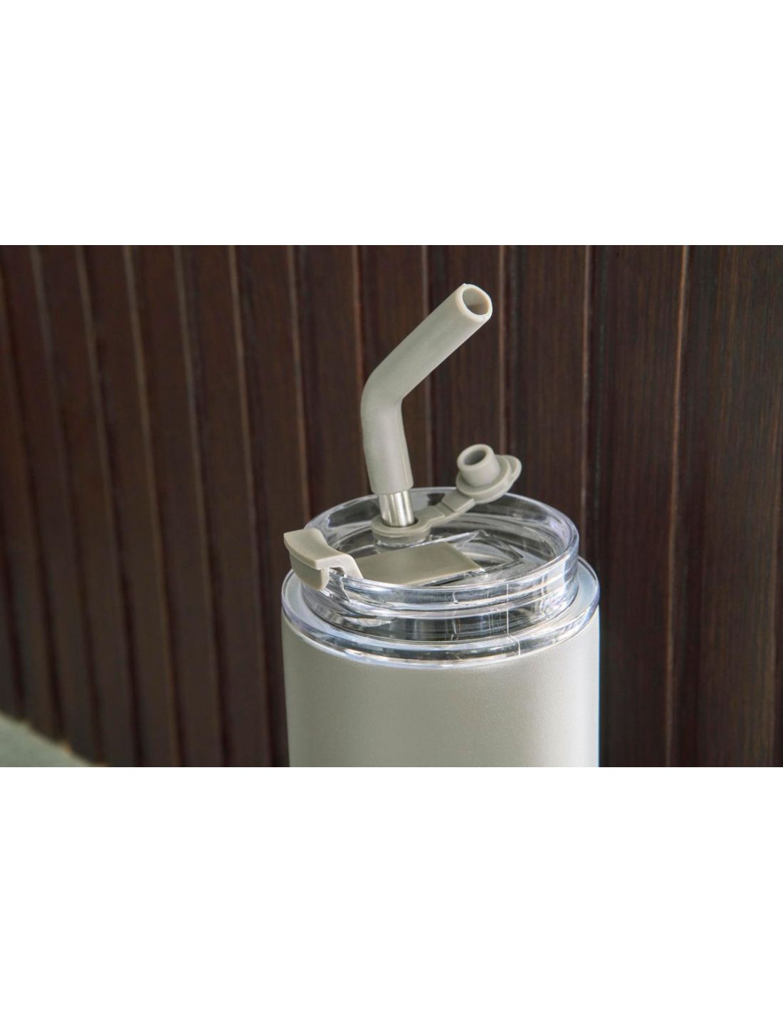 Botella termo de acero inoxidable (500 ml) con interior de acero inoxidable 304 y exterior 201. Incluye dos tapas: una de PP con asa y una de PS transparente para usar con la pajita de acero inoxidable incluida, con punta de silicona y soporte. Presentada en una caja de cartón marrón.