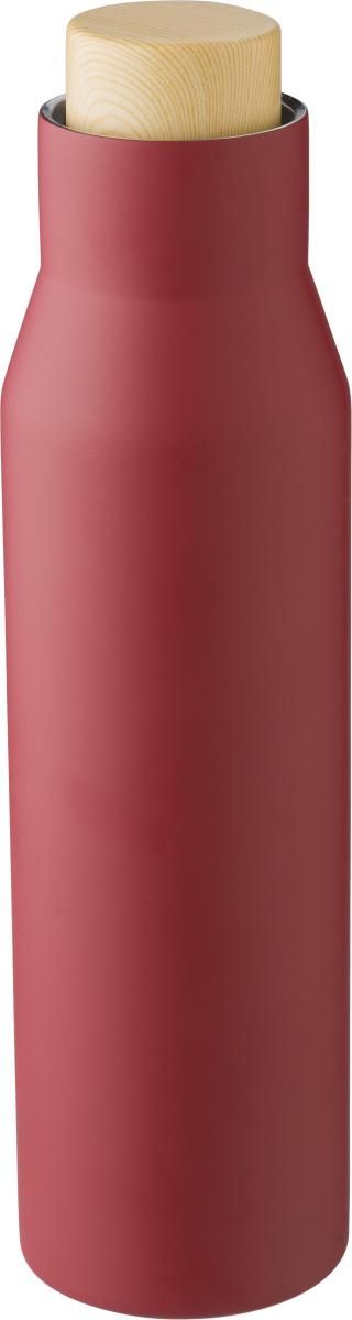 Botella termo de acero inoxidable (s/s304) (500 ml) con doble pared y tapón de rosca símil bambú. Presentada en una caja de cartón marrón. A temperatura ambiente, mantiene los líquidos fríos/calientes aprox 6-8h. Evitar bebidas ácidas o con gas.