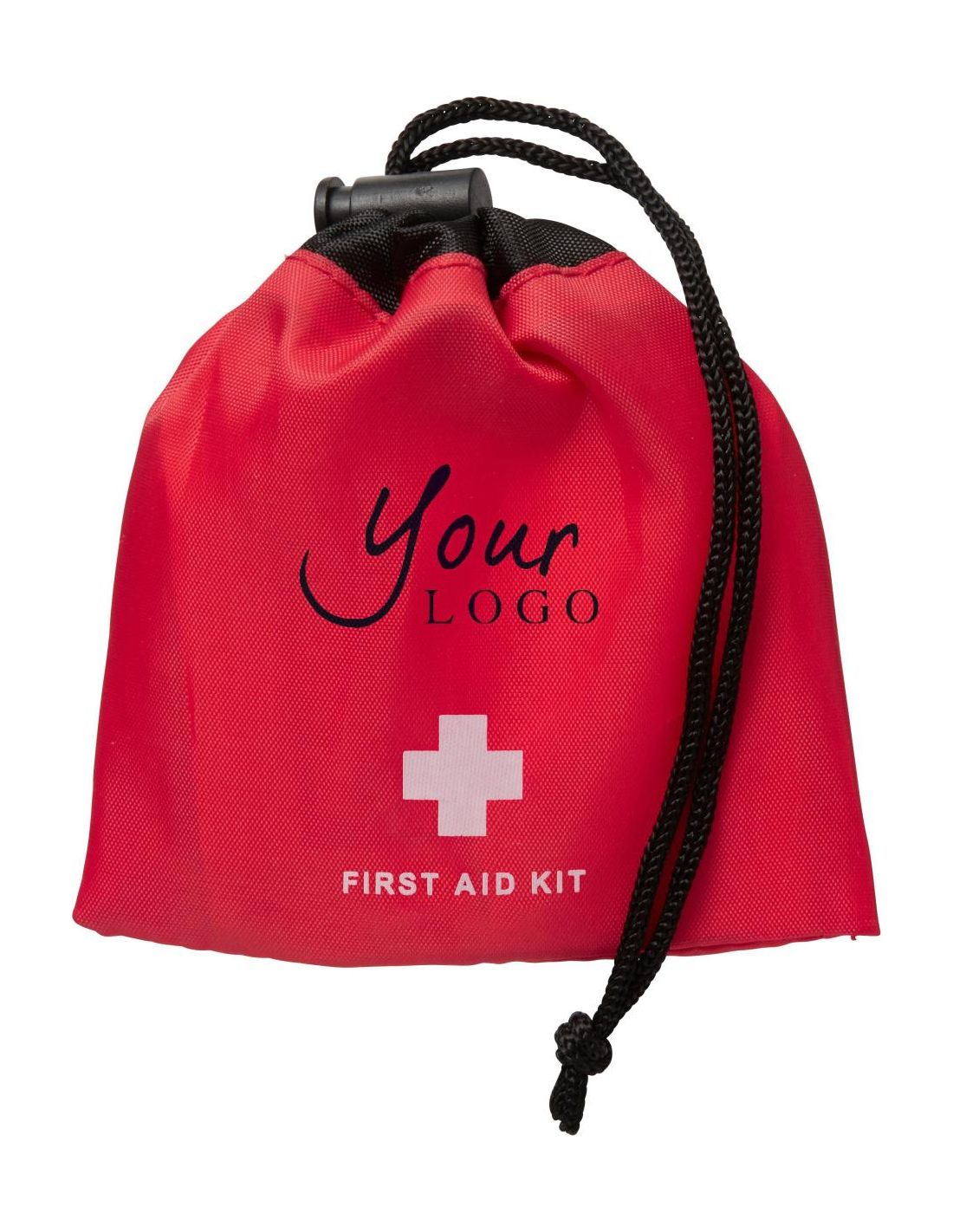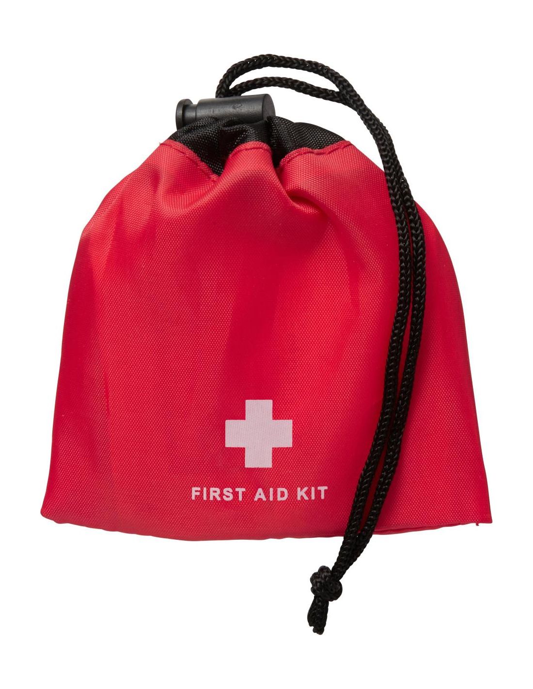 Botiquín de 10 piezas, en una bolsa de ABS con cordón. Contiene 1 toallita limpiadora, 5 tiritas, 2 toallitas de alcohol, 1 toallita antiséptica y 1 gasa.