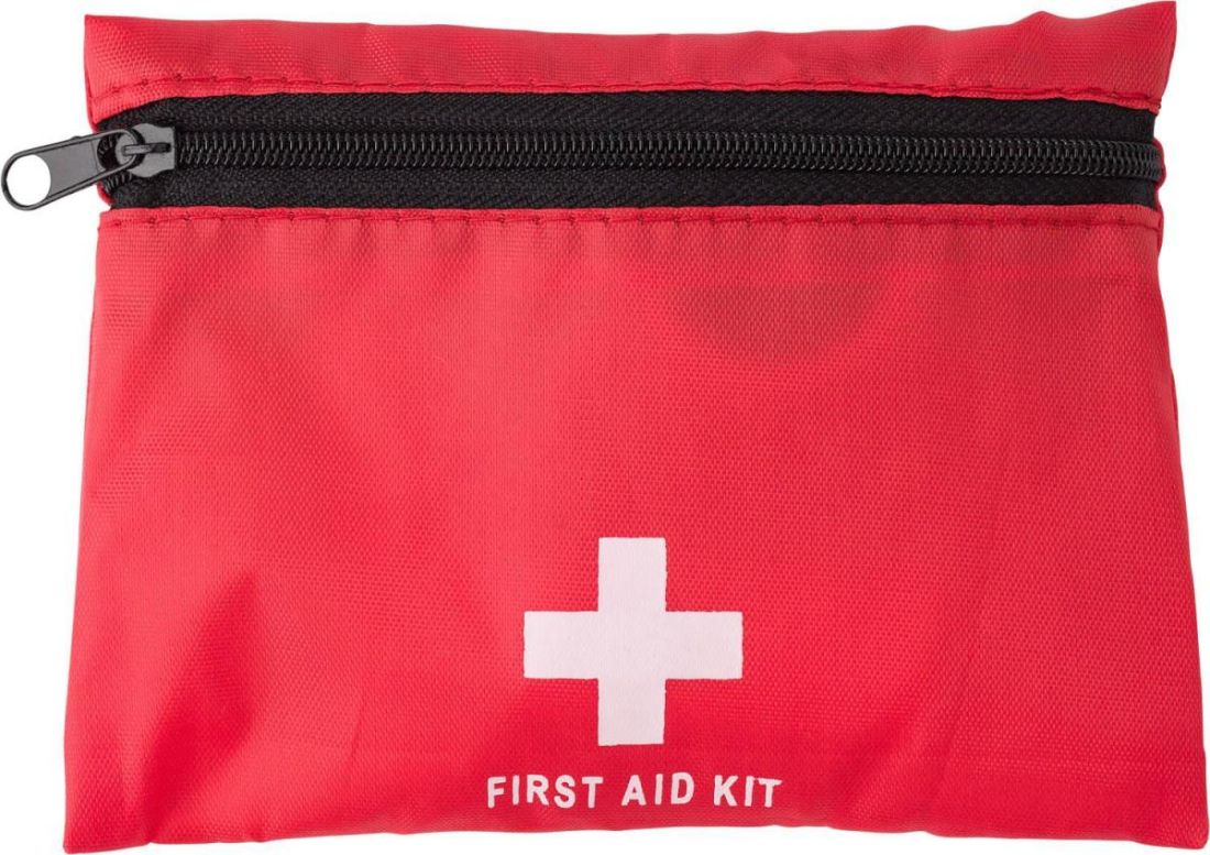 Botiquín de nilón (210 T) con cremallera. Contiene alcohol, crema antiséptica, crema calmante de picaduras, tirita, gasa, venda, esparadrapo, pinzas y tijeras.