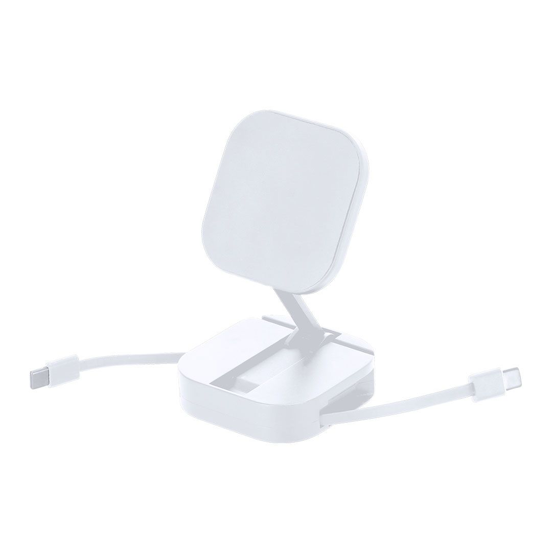 Cable cargador soporte magnético 2 en 1 de 60W, fabricado en ABS reciclado (RABS). Diseñado para la carga simultánea del smartphone a través del soporte magnético y mediante cable. Cuenta con soporte plegable con ajuste de posición. Cable retráctil de 80 cm con función de carga y transferencia de datos compatible con dispositivos que cuenten con entrada USB-C.