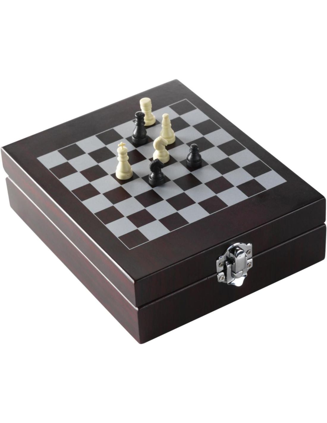 Set de vino con abrebotellas, termómetro, argolla antigoteo y tapón. Presentado en una caja de madera con un juego de ajedrez en la tapa
