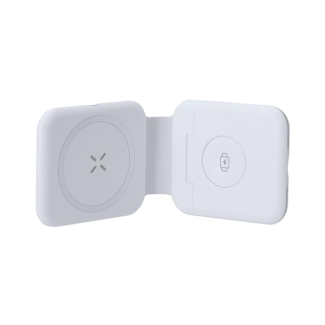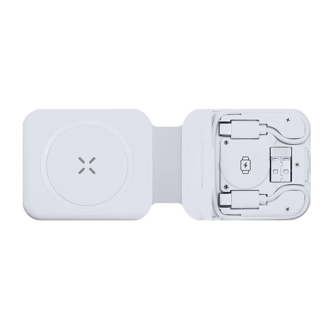 Completo multicargador inalámbrico 15W con soporte para gadgets 3 en 1 plegable. Diseñado para la carga simultánea del smartphone/auriculares y smartwatch: una estación de carga todo en uno. Incluye set de cables Tipo C y adaptador USB, aptos para la transferencia de datos.