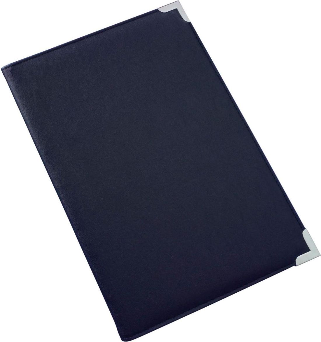 Carpeta de PU (A4), con esquinas metálicas y varios bolsillos. No incluye bloc de notas ni bolígrafo. La versión azul tiene esquinas plateadas y la negra, doradas.