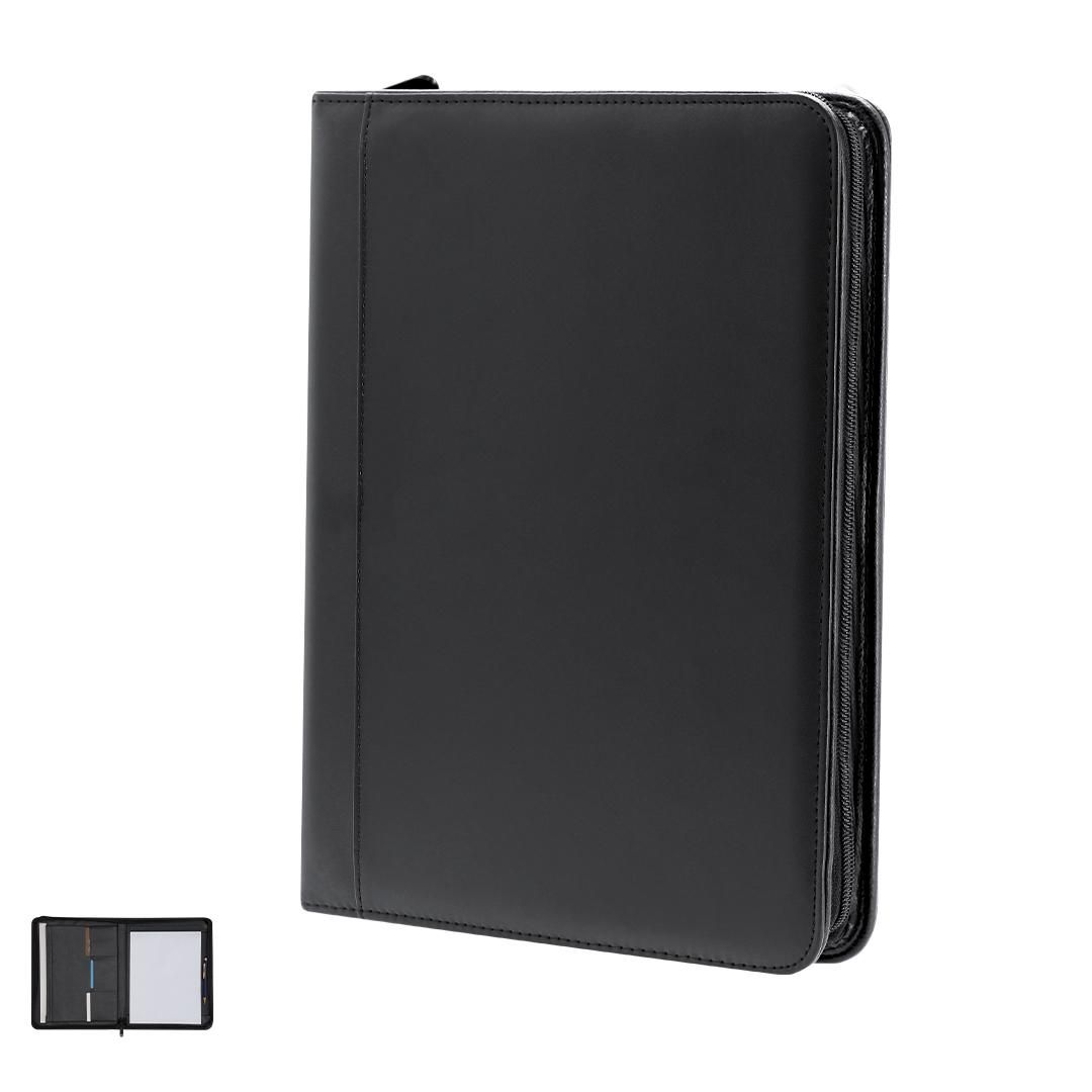 Elegante Carpeta con cremallera en PU reciclado. Con 4 compartimentos interiores en PU Reciclada y soporte para bolígrafo. Incluye bloc de notas de 25 páginas en blanco.